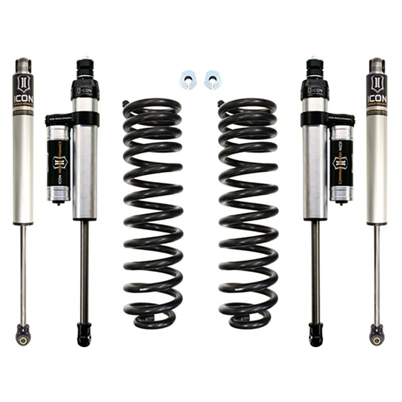 The Icon 2.5" suspension system is a great way to level your 4WD 2005-2016 Ford F250/350 Super Duty while improving ride quality and performance. This Stage 2 system is great for towing, rough construction site terrains, and country dirt roads all while keeping a smooth highway feel. Icon Stage 2 System is comprised of dual rate coil springs, alignment cams for adding caster, and Icon 2.5 Series piggyback reservoir shocks up front and 2.0 Aluminum Series internal reservoir shock in the rear. Icon 2.5" reservoir shocks up front ensure optimum performance by increasing the duration of consistent damping regardless of situation, keeping the shocks at a cooler operating temperature during heavy use. With the endless hours Icon has spent testing and tuning our suspension components and shocks as a complete package, you can rest assured you have the best suspension solution on the market.