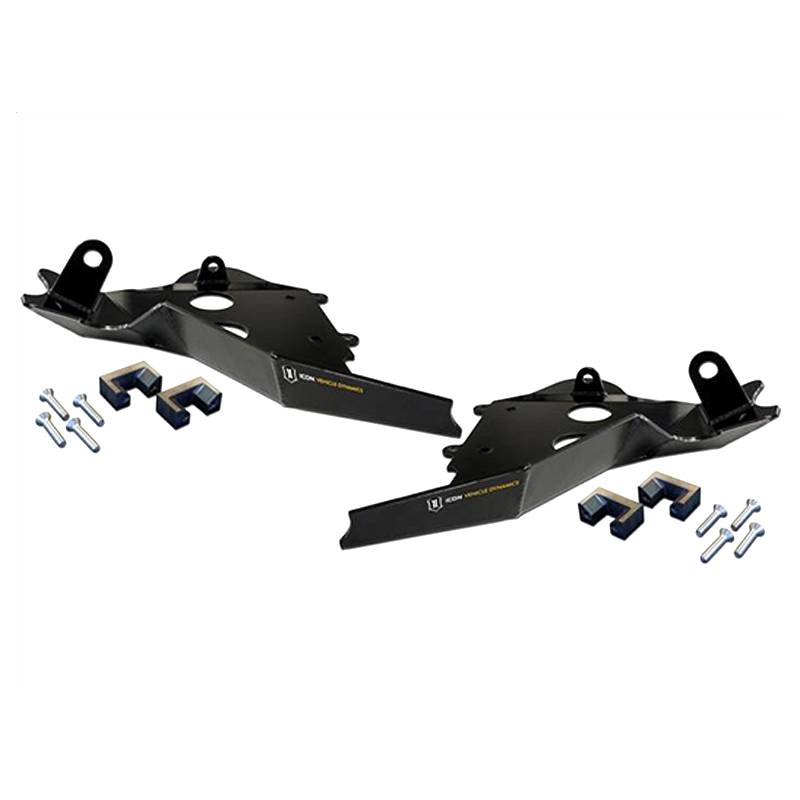Icon vehicle dynamics ford raptor SVT lower control arm skid plate system offers added protection in on or off-road situations for the factory aluminum arms. These lower control arms can dent or ding easily from smashing rocks and other offroad elements. We developed Icon steel protective lower arm skid plates to help absorb those unexpected harsh impacts, reducing the risk of costly damage. Icon A-arm skid plates are a must-have for the avid off-roader that uses their ford raptor in situations such as hunting, chase trucking at off-road races, running dirt roads on the farm or driving in harsh winter conditions with loaded down roads. Skid plates also serve to provide some bolt-on visual improvements, simply making the truck look even more off-road capable than it already is. Raptor owners can make a sure bet that the Icon vehicle dynamics lower control arm skid plate system will make their truck stand out in a crowd, all while being able to come out unscathed in the nastiest offroad conditions.
