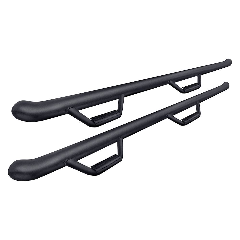 The nerf bars have a patented hoop step design featuring a 2" and 3" main tube diameter. The 2" tube applications include an .095 wall steel tubing, while 3" tube applications include an .084 wall steel tubing. The patented drop-down step design and location is engineered to allow for ease of access to stock or lifted vehicles. This application fits high and tight to the vehicle body for a clean, modern style and protection from road debris.