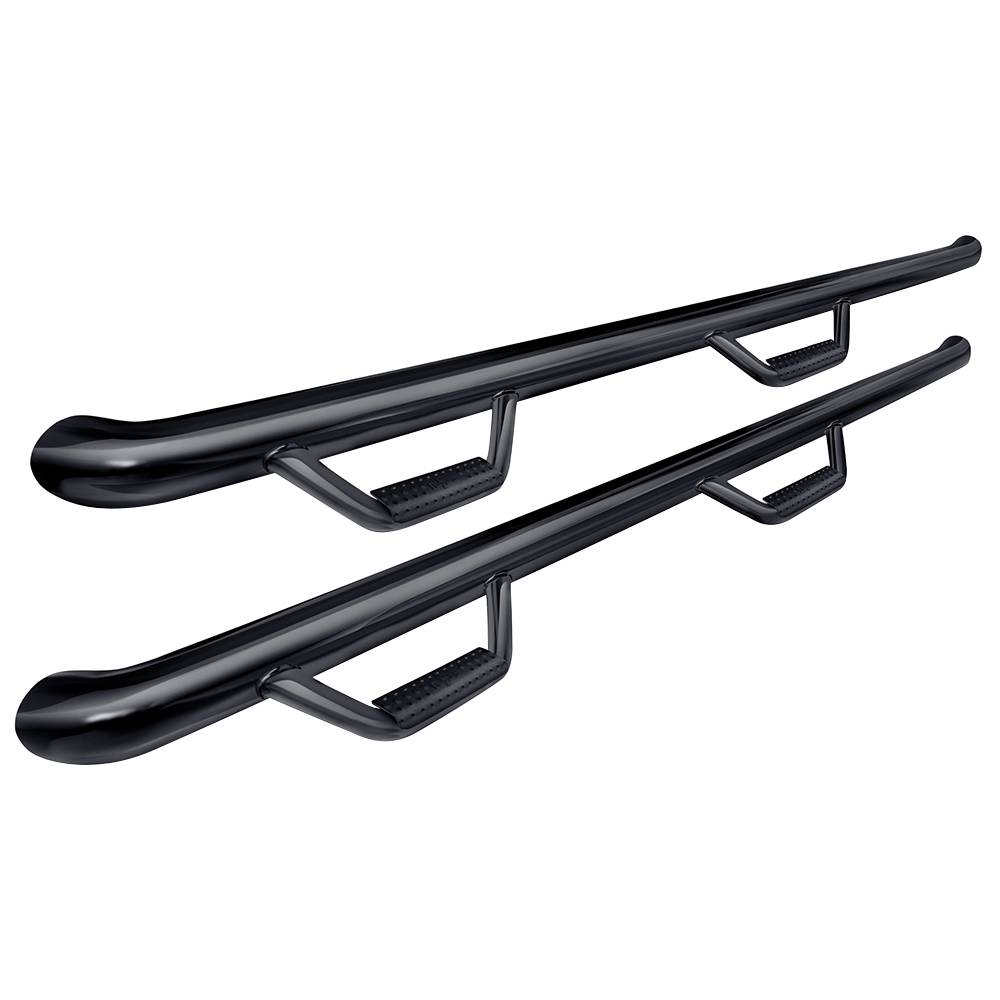 The nerf bars have a patented hoop step design featuring a 2" and/or 3" main tube diameter. The 2" tube applications include an .095 wall steel tubing, while 3" tube applications include an .084 wall steel tubing. The patented drop-down step design and location is engineered to allow for ease of access to stock or lifted vehicles. This application fits high and tight to the vehicle body for a clean, modern style and protection from road debris.
