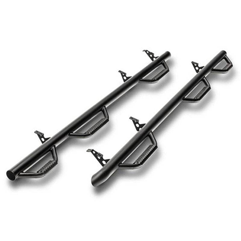 The nerf bars have a patented hoop step design featuring a 2" and/or 3" main tube diameter. The 2" tube applications include an .095 wall steel tubing, while 3" tube applications include an .084 wall steel tubing. The patented drop-down step design and location is engineered to allow for ease of access to stock or lifted vehicles. This application fits high and tight to the vehicle body for a clean, modern style and protection from road debris.