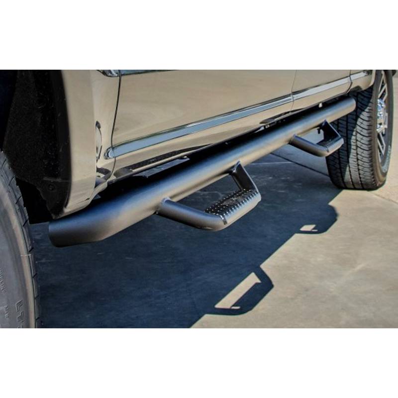 The nerf bars have a patented hoop step design featuring a 2" and/or 3" Main tube diameter. The 2" tube applications include an .095 wall steel tubing, while 3" tube applications include an .084 wall steel tubing. The patented drop-down step design and location is engineered to allow for ease of access to stock or lifted vehicles. This application fits high and tight to the vehicle body for a clean, modern style and protection from road debris. The N-Fab cab length nerf bars feature a fully welded 1-piece construction for strength, long lasting durability and ease of installation.