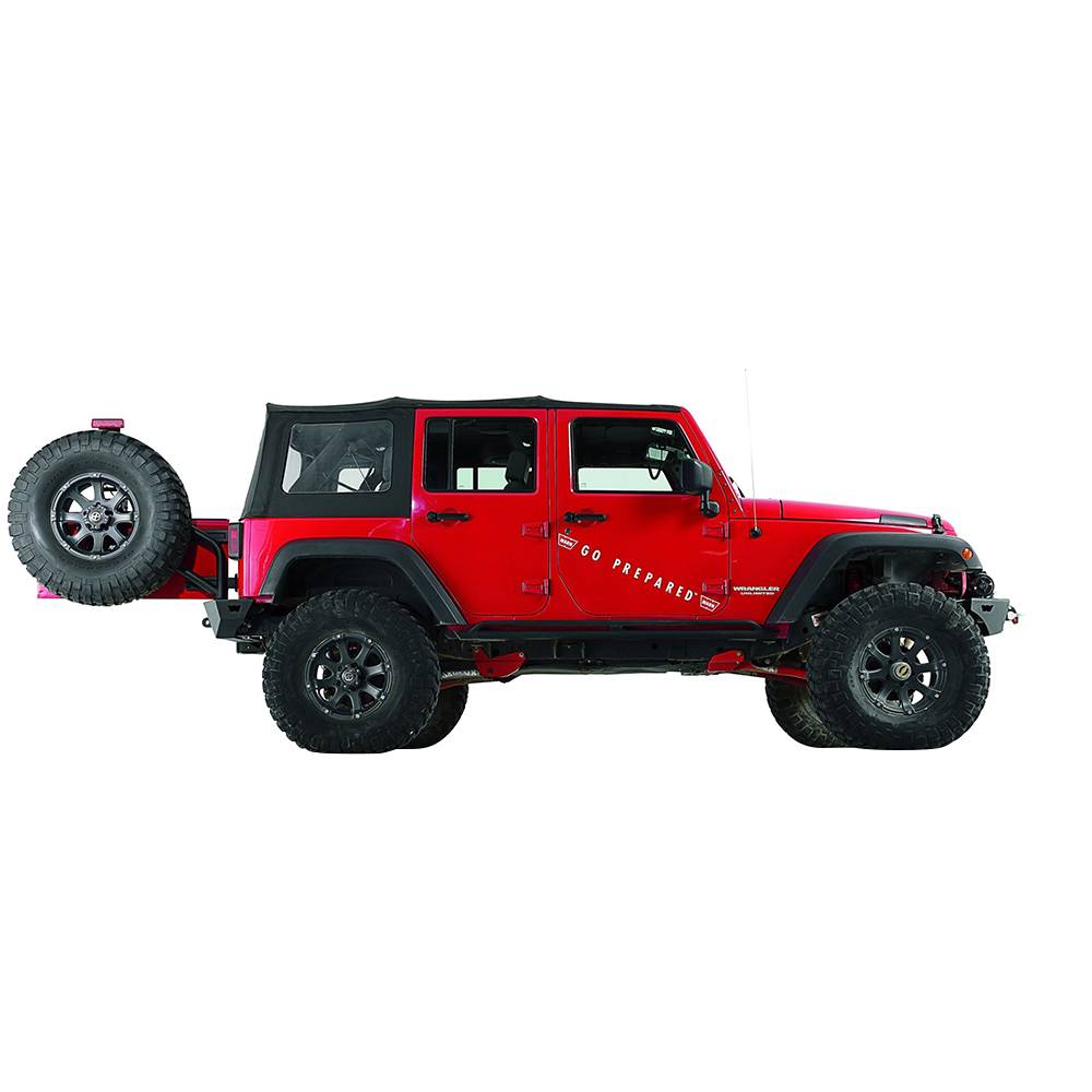 The Warn JK Tire Carrier has been engineered and built to be more durable and easier to use. The Tire Carrier uses a chassis-mounted pivot and has a tailgate-synchronized swing-out design. It can be easily opened with one hand, and takes the weight off of the tailgate. Plus, the unique anti-vibration design keeps things quiet on and off the trail.