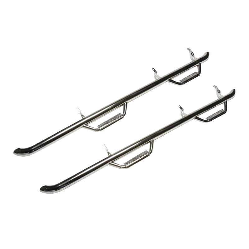 The nerf bars have a patented hoop step design featuring a 2" and/or 3" main tube diameter. The 2" tube applications include an .095 wall steel tubing, while 3" tube applications include an .084 wall steel tubing. The patented drop-down step design and location is engineered to allow for ease of access to stock or lifted vehicles. This application fits high and tight to the vehicle body for a clean, modern style and protection from road debris.