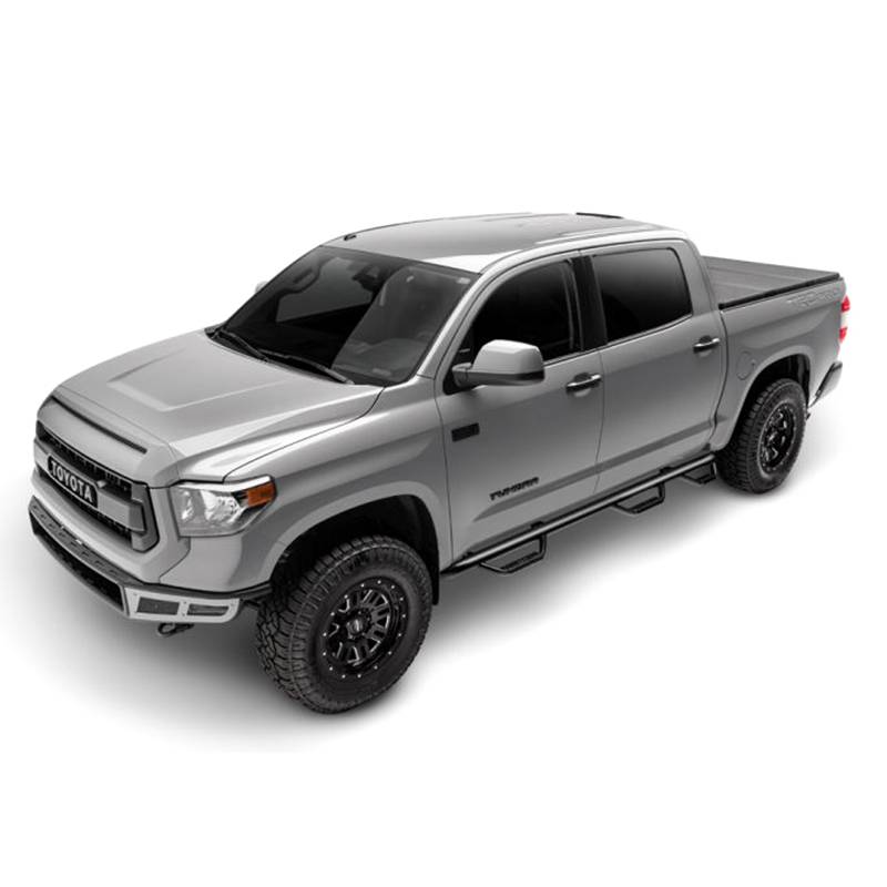 The nerf bars have a patented hoop step design featuring a 2" and/or 3" main tube diameter. The 2" tube applications include an .095 wall steel tubing, while 3" tube applications include an .084 wall steel tubing. The patented drop-down step design and location is engineered to allow for ease of access to stock or lifted vehicles. This application fits high and tight to the vehicle body for a clean, modern style and protection from road debris.