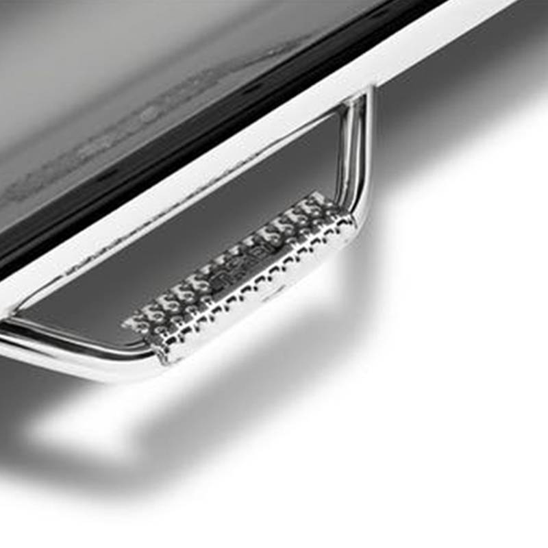 The nerf bars have a patented hoop step design featuring a 2" and/or 3" main tube diameter. The 2" tube applications include an .095 wall steel tubing, while 3" tube applications include an .084 wall steel tubing. The patented drop-down step design and location is engineered to allow for ease of access to stock or lifted vehicles. This application fits high and tight to the vehicle body for a clean, modern style and protection from road debris.