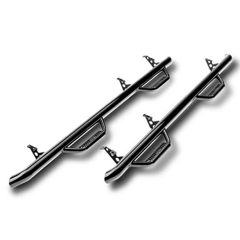 The nerf bars have a patented hoop step design featuring a 2" and/or 3" main tube diameter. The 2" tube applications include an .095 wall steel tubing, while 3" tube applications include an .084 wall steel tubing. The patented drop-down step design and location is engineered to allow for ease of access to stock or lifted vehicles. This application fits high and tight to the vehicle body for a clean, modern style and protection from road debris.