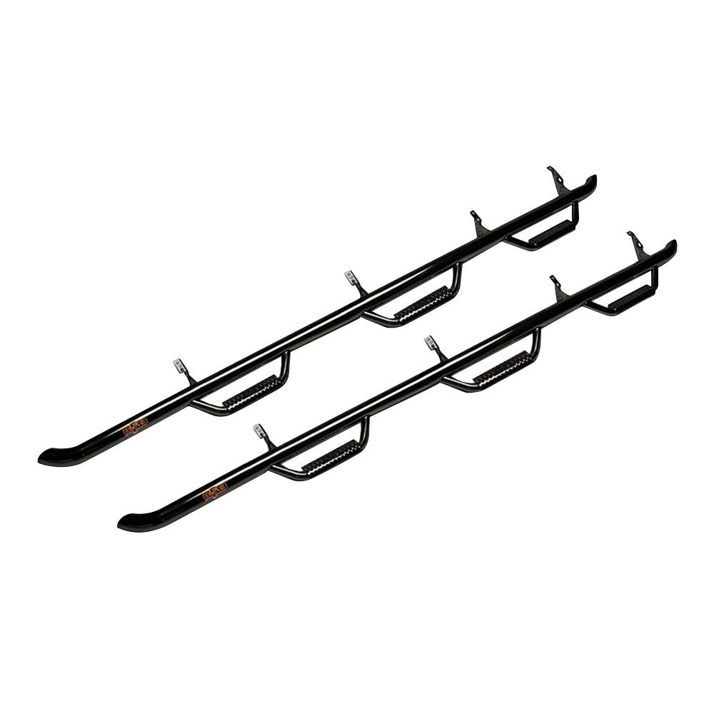 The nerf bars have a patented hoop step design featuring a 2" and/or 3" Main tube diameter. The 2" tube applications include an .095 wall steel tubing, while 3" tube applications include an .084 wall steel tubing. The patented drop-down step design and location is engineered to allow for ease of access to stock or lifted vehicles. This application fits high and tight to the vehicle body for a clean, modern style and protection from road debris.