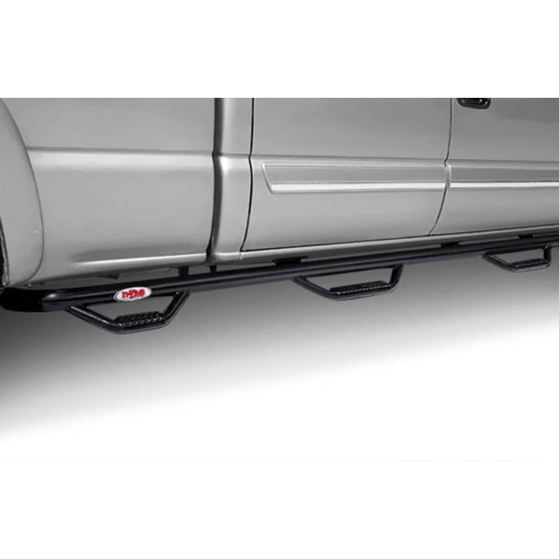 The nerf bars have a patented hoop step design featuring a 2" and/or 3" Main tube diameter. The 2" tube applications include an .095 wall steel tubing, while 3" tube applications include an .084 wall steel tubing. The patented drop-down step design and location is engineered to allow for ease of access to stock or lifted vehicles. This application fits high and tight to the vehicle body for a clean, modern style and protection from road debris.