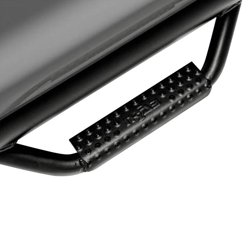 The nerf bars have a patented hoop step design featuring a 2" and/or 3" main tube diameter. The 2" tube applications include an .095 wall steel tubing, while 3" tube applications include an .084 wall steel tubing. The patented drop-down step design and location is engineered to allow for ease of access to stock or lifted vehicles. This application fits high and tight to the vehicle body for a clean, modern style and protection from road debris.