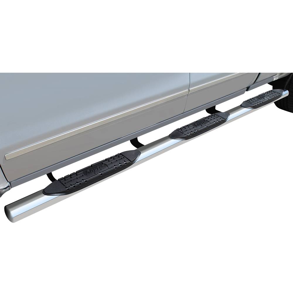 The 4" stainless steel wheel to wheel oval step vars provide a 3rd step for bed access without sacrificing that custom look. These bars also feature a full 4" raised saddle style step pad with the Raptor Series logo in the middle. This tubes come with seamless welded end caps.