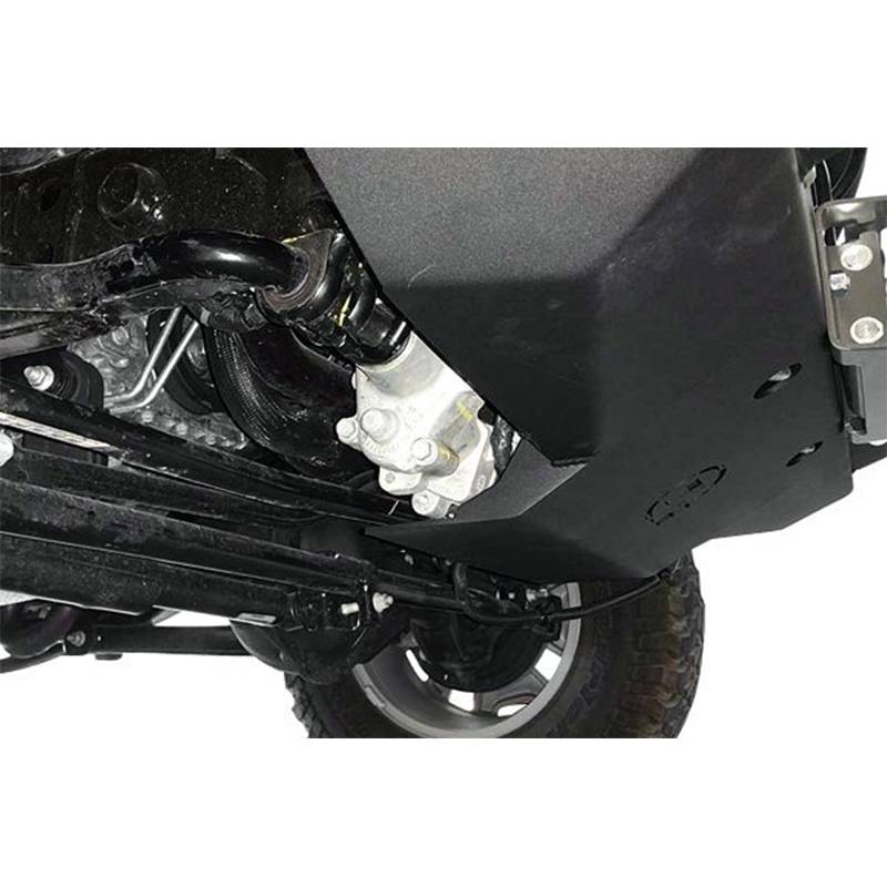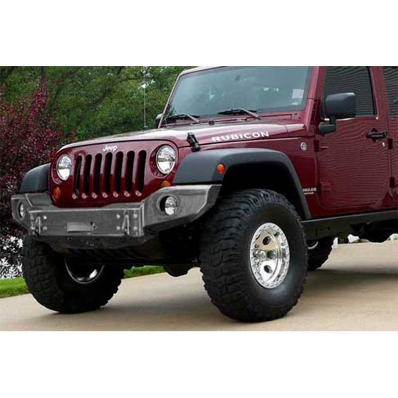 Full protection and winch mount for the wrangler. Complete coverage full body width and filling the gap of OEM bumper up to the fenders. High strength 3/16" steel construction throughout. Better approach angle (requires removal of OEM crash bar between frame rails). Lower protection plate extending under aluminum sway bar disconnect mechanism.