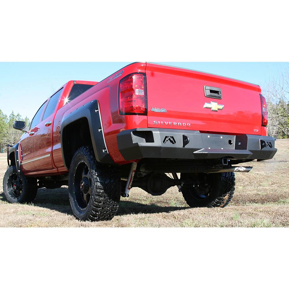 The Fab Fours Chevy 1500 rear replacement bumper integrates the existing receiver hitch. In addition to added style and formed-steel durability, the vehicle gains lower steps and recovery points. Designed to be the ultimate in functionally-stylish rear-end protection.