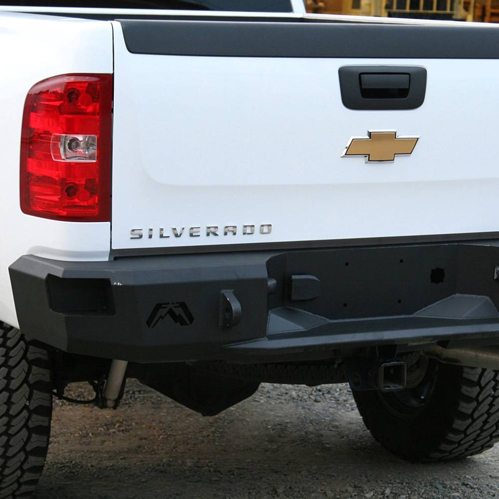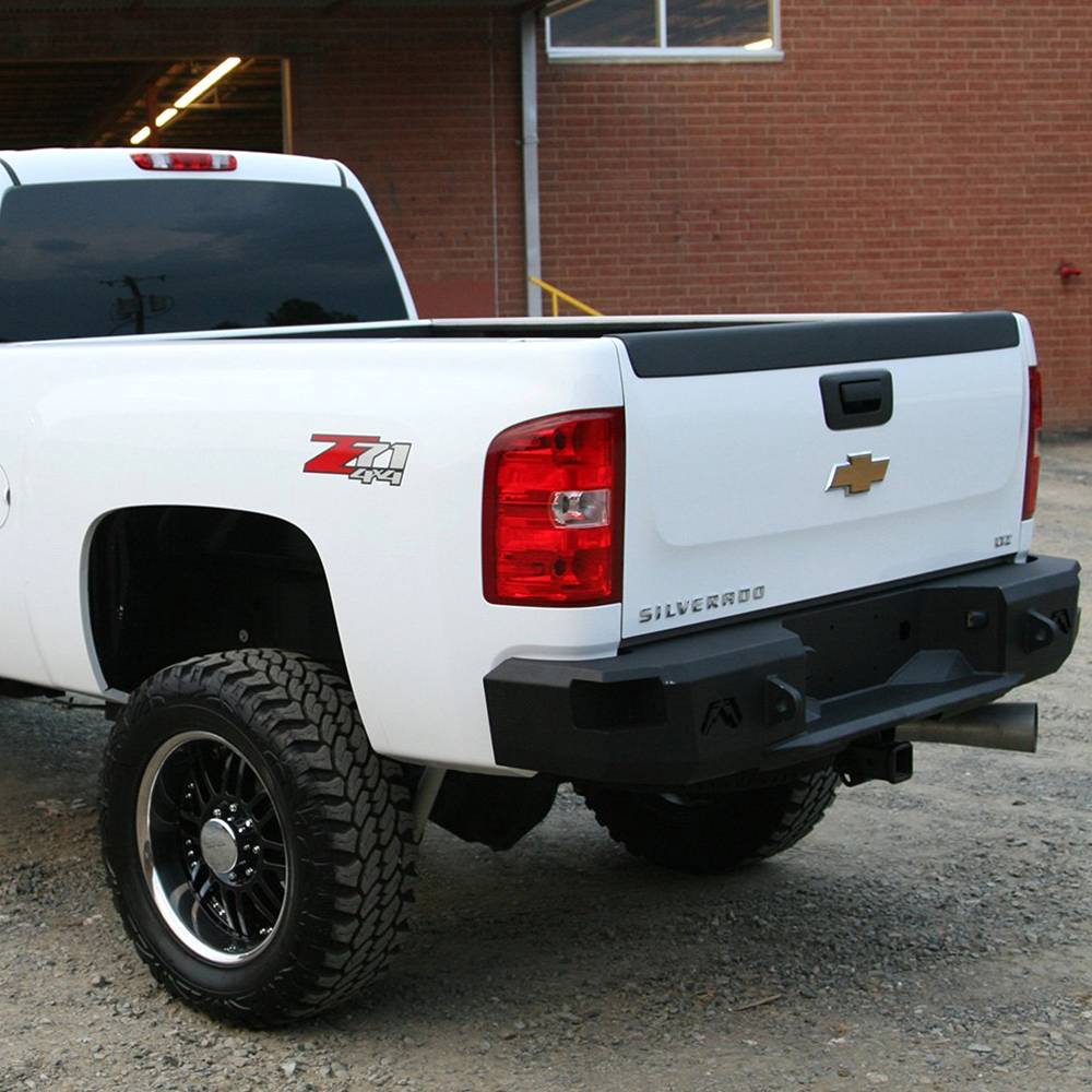 Chevy HD rear replacement bumper integrates the existing receiver hitch. In addition to added style and formed-steel durability, the vehicle gains lower steps and recovery points. Designed to be the ultimate in functionally-stylish rear-end protection.