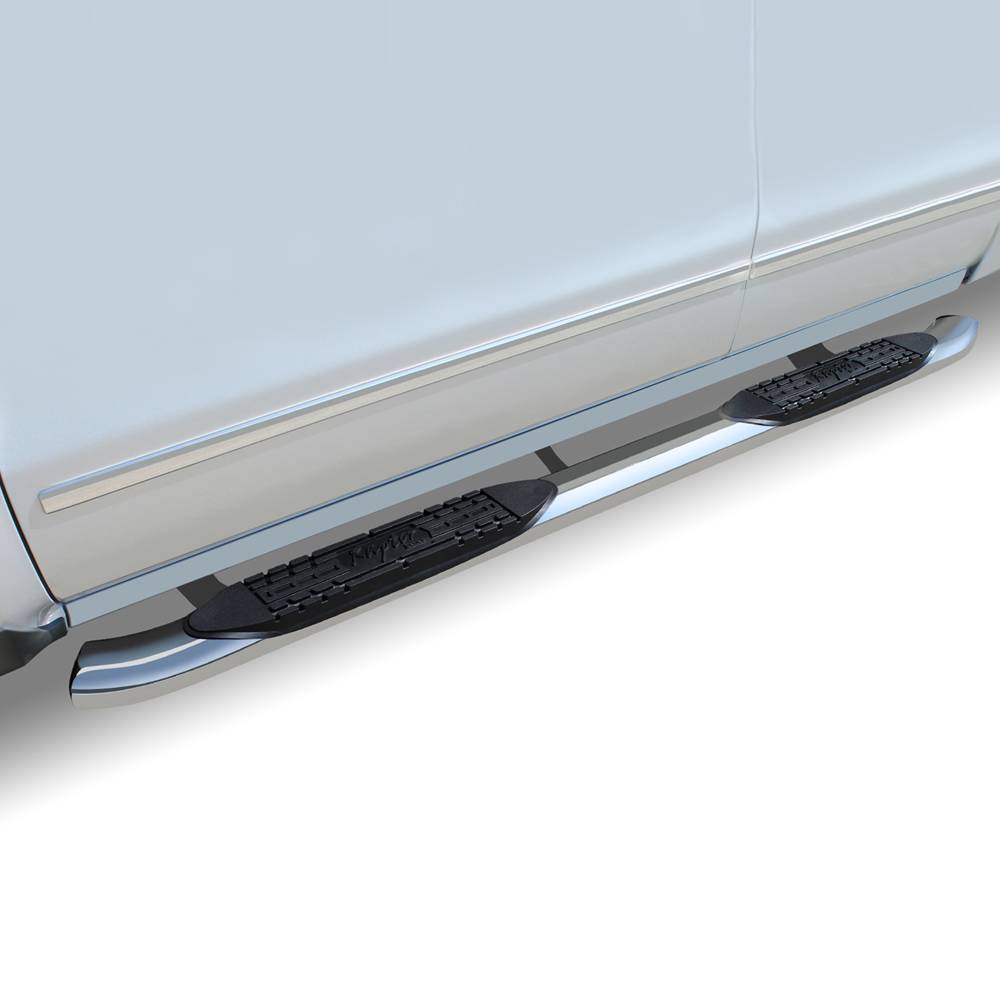 The Raptor Series its new curved 4" OE style stainless steel oval step bars. This new step features seamless welded end caps and 30 degree OE styled bends on each end.