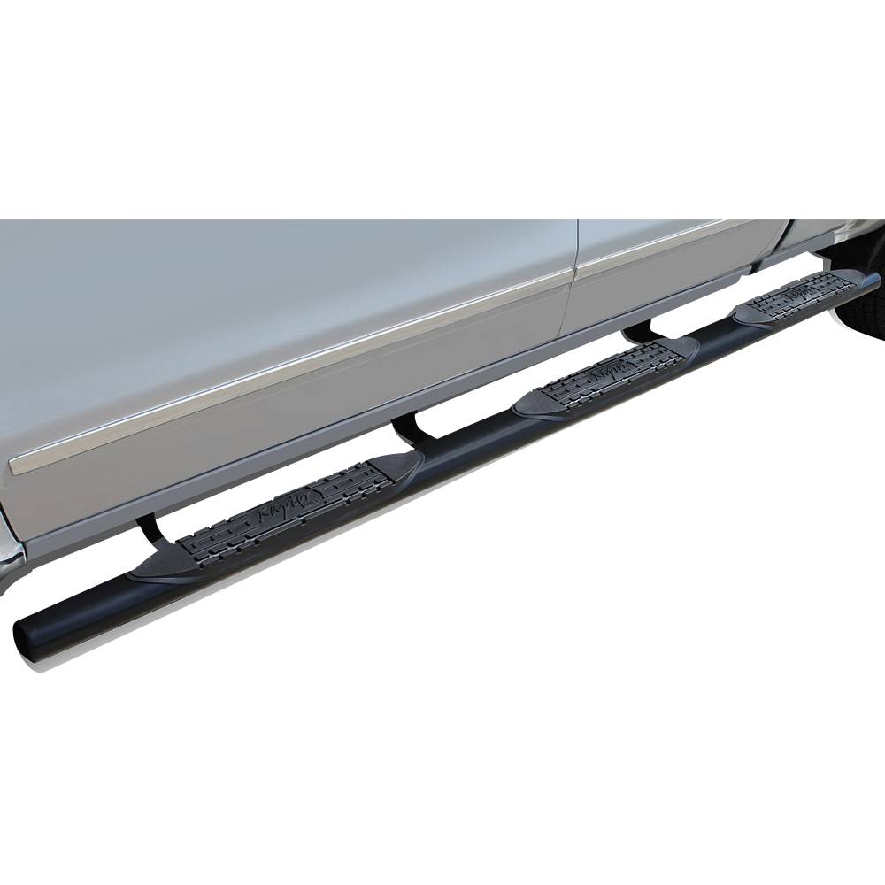 These 4" black E-coated wheel to wheel oval step bars provide a 3rd step for bed access without sacrificing that custom look. These oval step bars also feature a full 4" raised saddle style step pad with the Raptor Series logo in the middle. They come with seamless welded end caps.