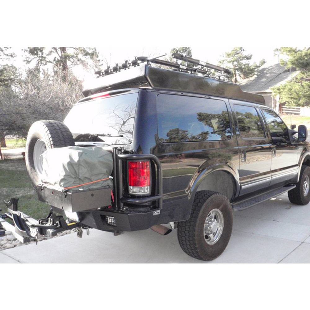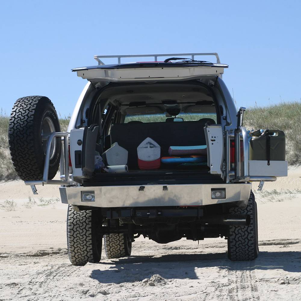 Storage is a premium when taking your family on long vacations, and if your Excursion has over-sized tires then you also have to compete with a tire that no longer fits underneath your vehicle. The solution is an Aluminess Rear Bumper. With 2 swing Arm to hold your spare tire and a storage box you will now have more room for the essentials inside your Excursion. In most cases any of the Aluminess boxes will work on the swing arm, so whether its extra fuel, a generator, or recovery gear that you need, your Aluminess Rear Bumper is there to save the day.