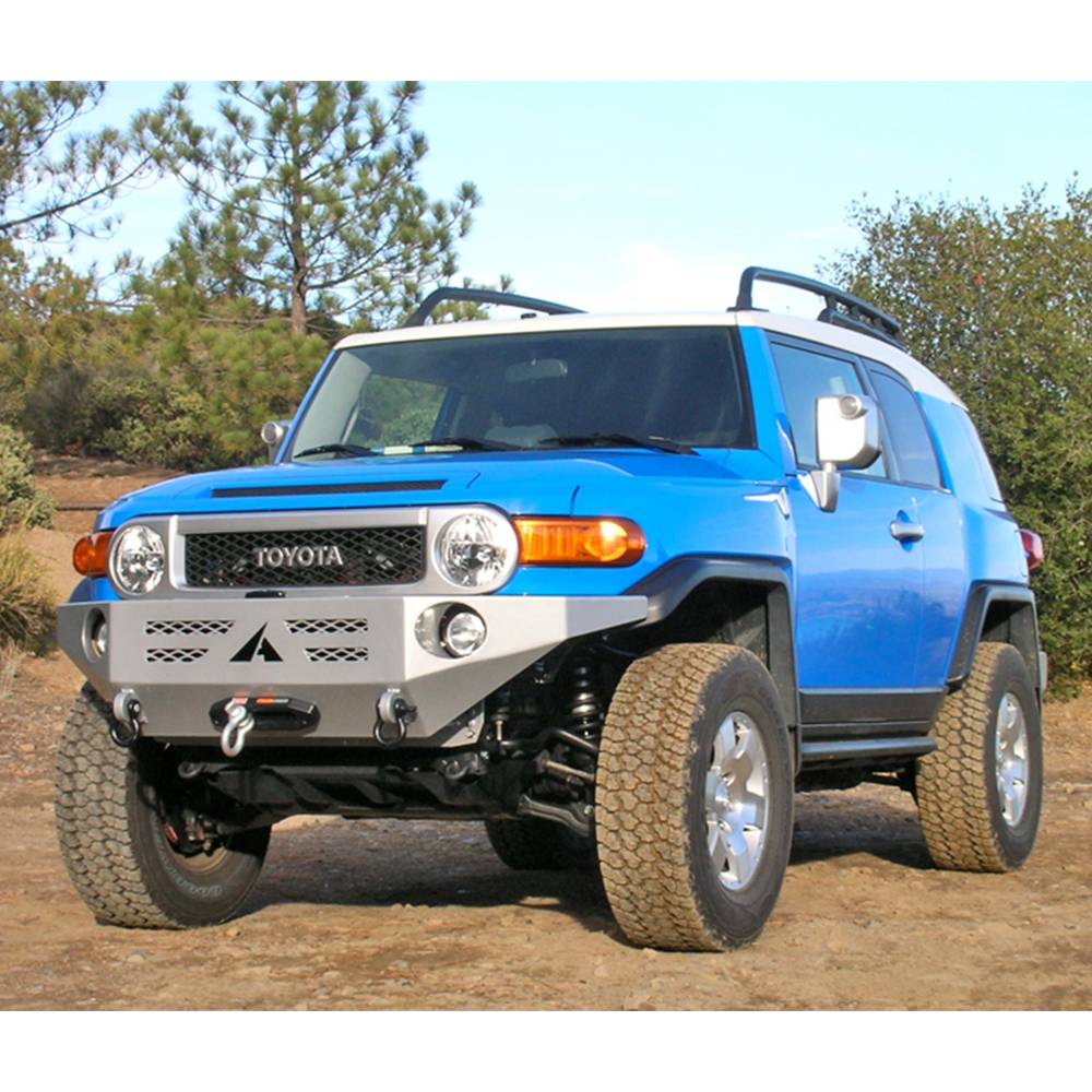 The Aluminess Toyota FJ Cruiser is a durable off-road machine. The only thing it's missing is a durable bumper. Take the manufacturer's plastic off and replace it with an Aluminess winch bumper. It weighs only 55 pounds so you won't have to worry about suspension upgrades or possibly shortened life of your brakes, tires, and/or steering components. This winch compatible bumper is powder coated black and will come with tow hooks welded in.