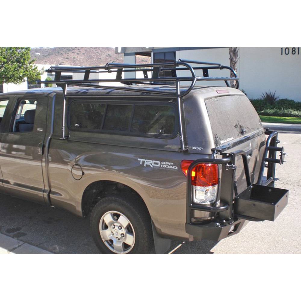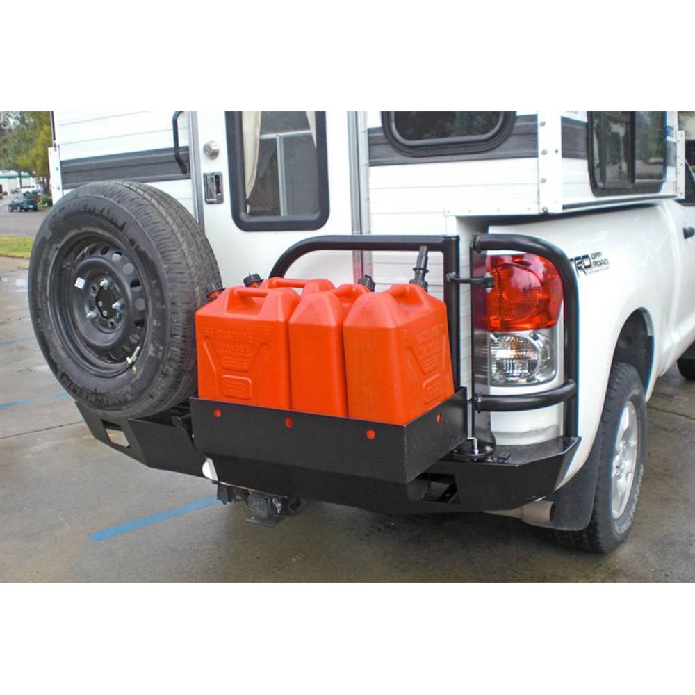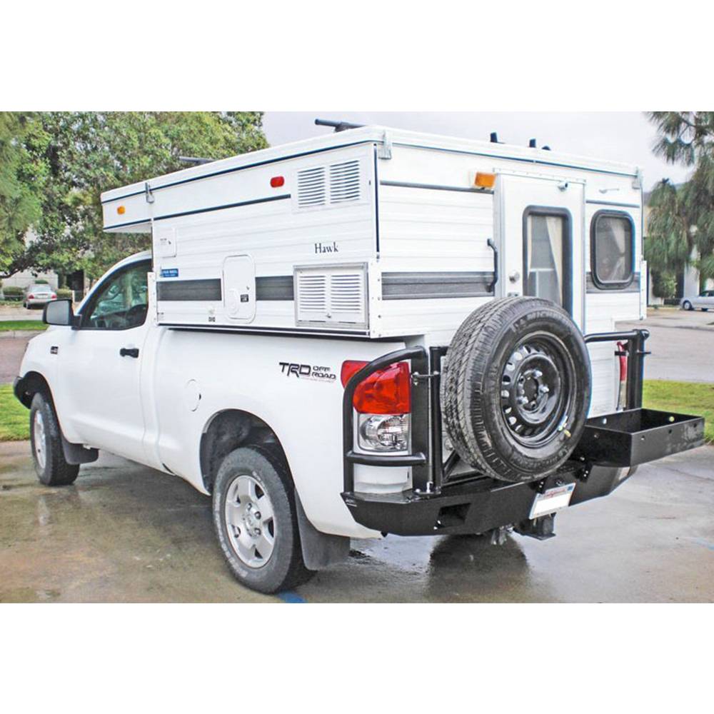 The new Toyota Tundra is a popular platform for campers. With available four-wheel drive, full-size beds, and decent gas mileage, one can fit a number of quality campers on the back. The problem is that storage in campers is at a minimum. Aluminess has a rear bumper for the Tundra that solves the problem of storage with a dual swing out that has multiple storage solutions to fit your needs. Whether you need to bring extra fuel, a generator, tools, or a variety of other things, rear bumper can carry it. You can even fit a full-size spare on a swing arm to ensure that you can get home safely in the event of a flat.