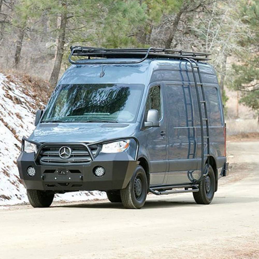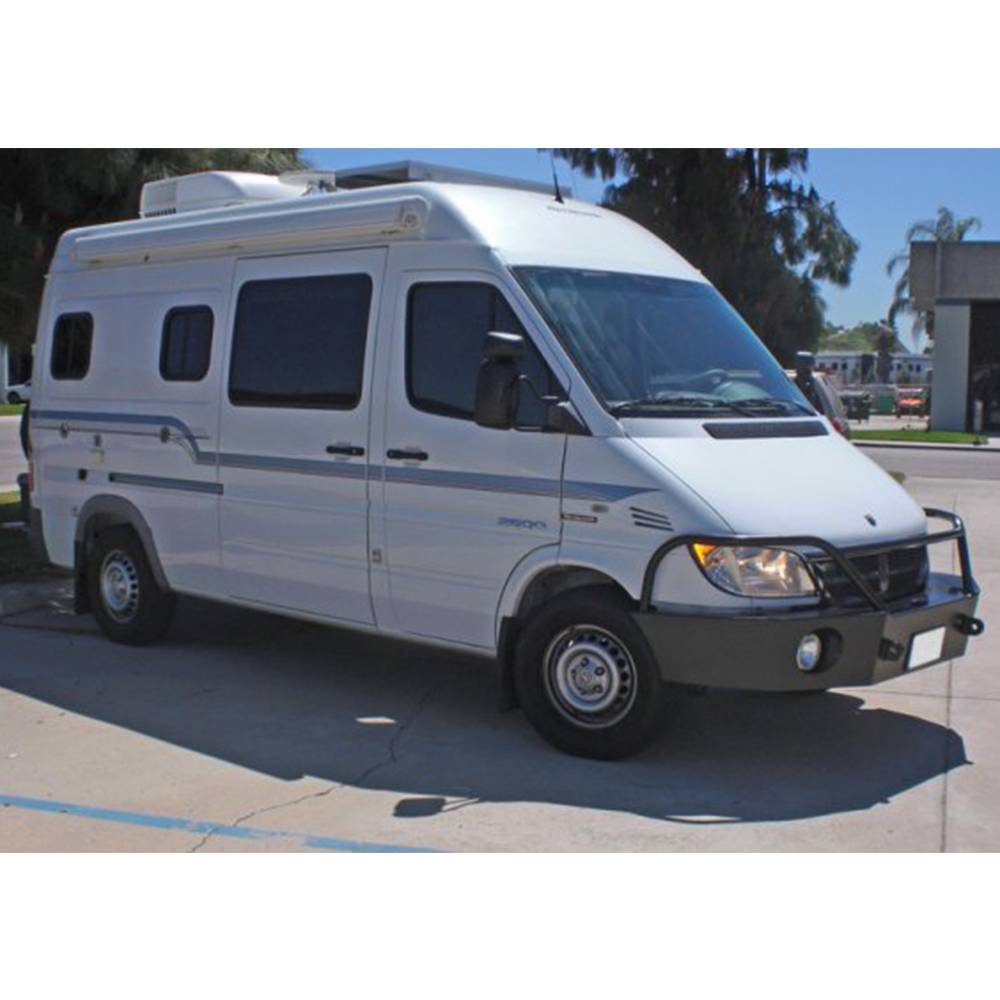 Sprinters are great vehicles for traveling. They have a ton of room and can be converted to motorhomes or mobile garages. The big drawback is their fragile front end. With the Aluminess front bumper, Sprinters finally have the protection they need from wildlife. They have a tool box built in for extra storage of those items you don't want inside. They weigh only 90 pounds and are designed to fit the sleek lines that the Sprinter is known for.