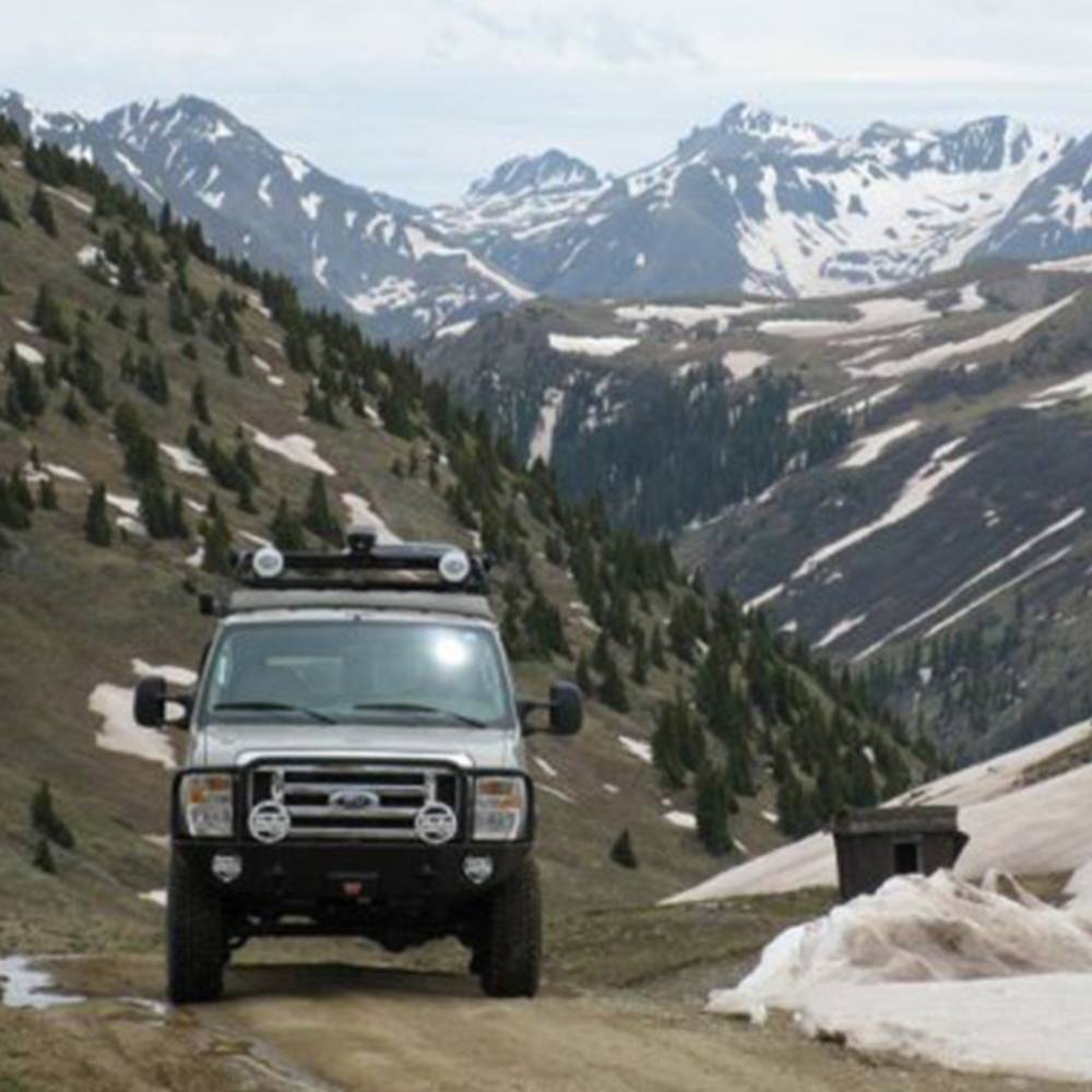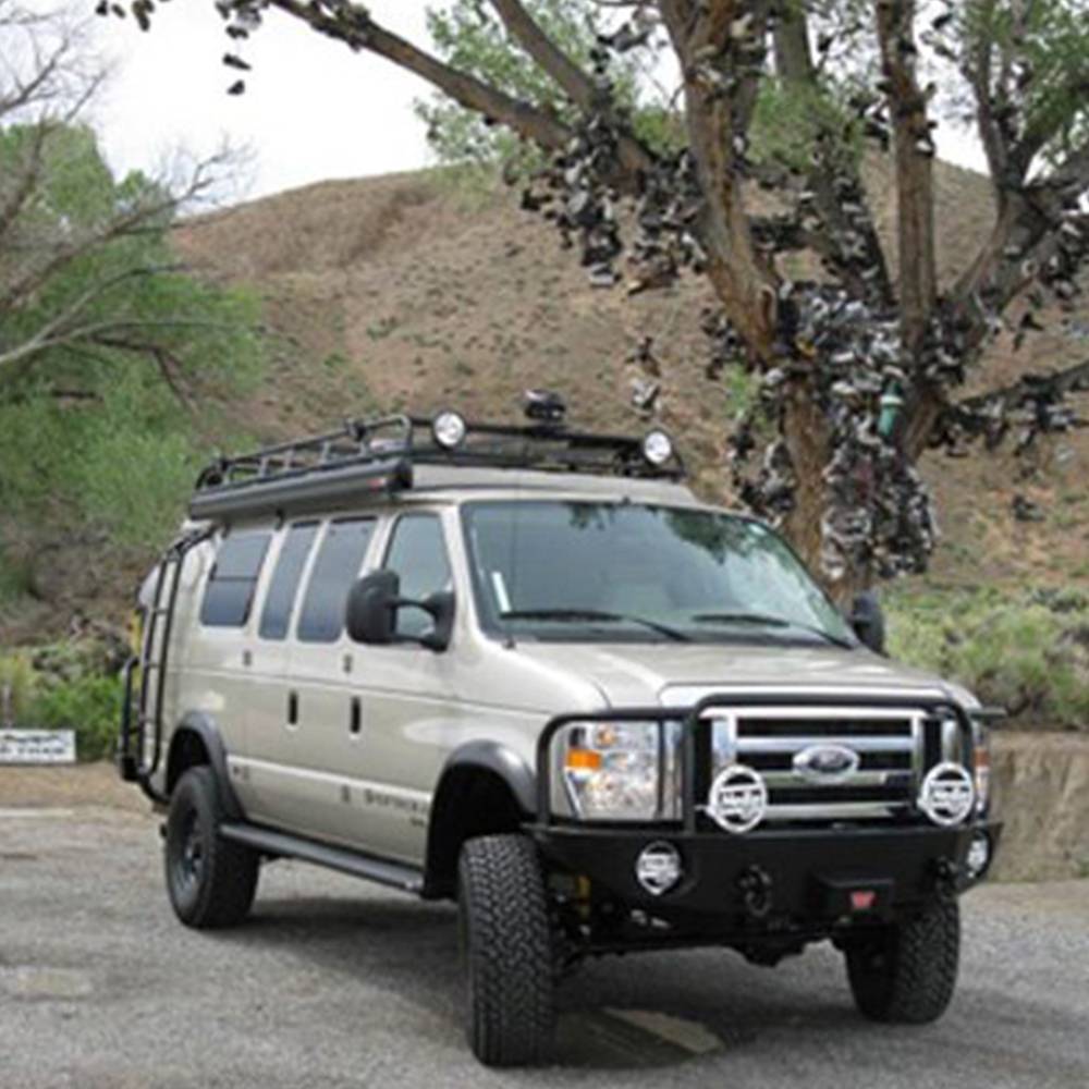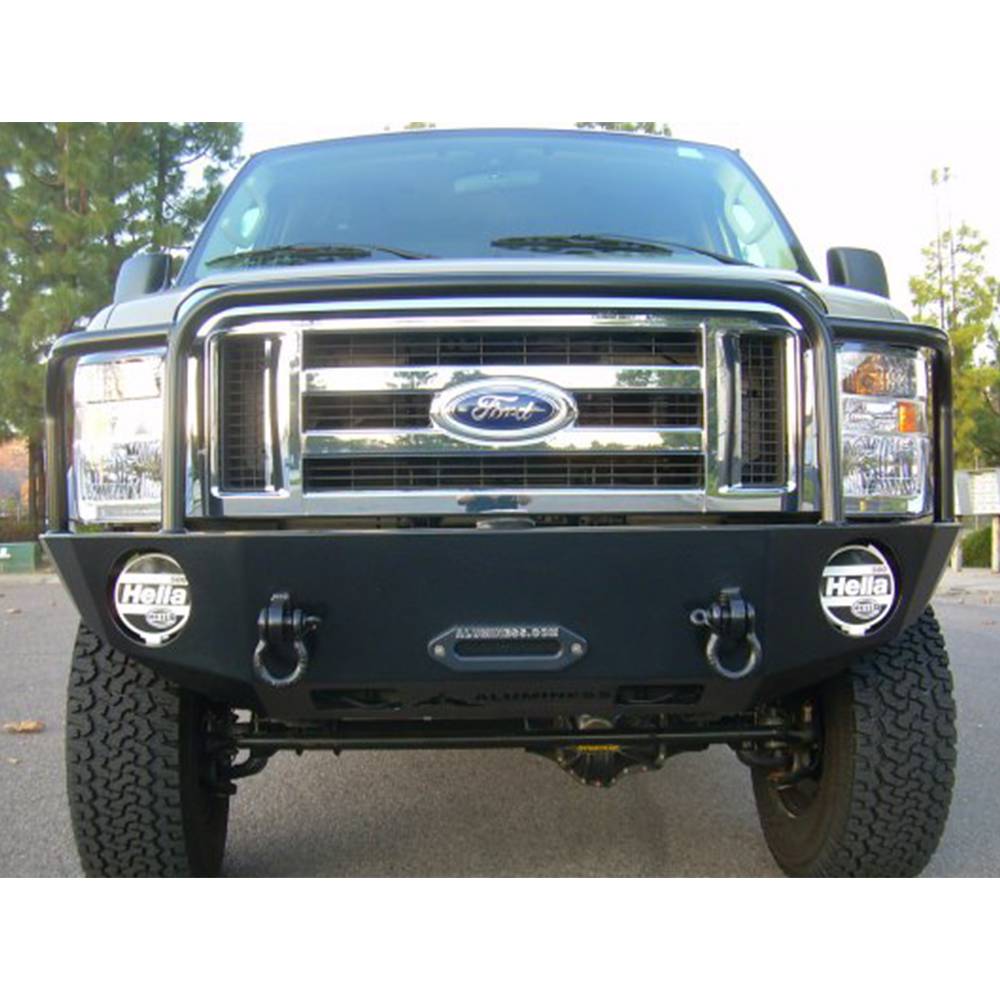 Ford redesigned the grill on the 2008 and newer Econoline, which allowed Aluminess to make a sleeker looking bumper. The Aluminess off road front bumper sits tucked back underneath the vehicle to keep length down while still protecting the front-end and housing a winch. The all-aluminum construction weighs just 85 pounds, so there is no need to worry about brakes, suspension, steering, and tires wearing out prematurely. Aluminum also doesn't rust, so your Aluminess bumper will hold up even in salty environments. The 2008-2014 Ford Econoline off road front bumper will hold a Warn M12000 or 16.5ti winch and is powder coated black. If you don't run a winch, the bumper has a lockable storage compartment to hold tire chains, tow straps, and many other parts you don't want cluttering up your van. We build shackle mounts into all of our front bumpers to accept a shackle with 7/8"pin. Whether you want to tackle the toughest trail or protect your rig against pesky wildlife, an Aluminess Bumper is sure to get the job done.