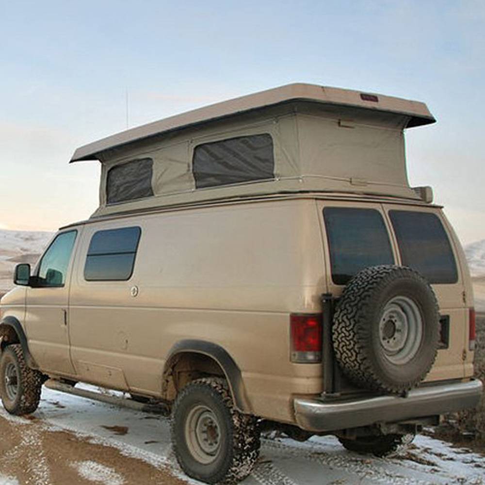 An Aluminess tire rack is essential to anyone converting their van to four-wheel drive. When upgrading to larger tires, your spare will likely no longer fit under your vehicle. Instead of leaving your spare at home (bad idea), you can equip your van with Aluminess tire rack! The rack mounts to the frame for a secure connection and is located on the driver side for easy access to the back of your van.