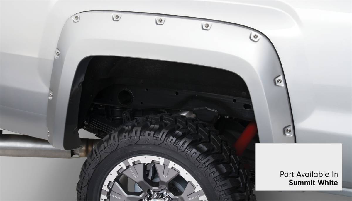 Bushwacker 40967-14 Pocket Style Painted Fender Flares 4 pc. - Front Tire Coverage 1.75 in. - Front Height 6.5 in. - Rear Tire Coverage 2 in - Rear Height 6.5 in. - Summit White