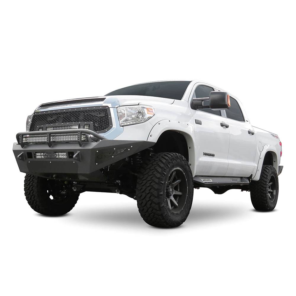 The honeybadger tundra front bumper is one of the toughest and most aggressive bumpers you can buy for the Toyota tundra with an aggressive style the honeybadger front bumper for the Toyota tundra gives your truck a tough look, while providing superior protection to your front end components. Reinforced clevis mounts made from 1" steel are designed to accommodate a 3/4" D-ring. Mounts for a 40" LED bar in the top hoop and a 20" LED bar in the center of the bumper provide your truck with extra lighting. Additional lighting options are available behind the side accent panels, accepting a 10" SR LED on each side.