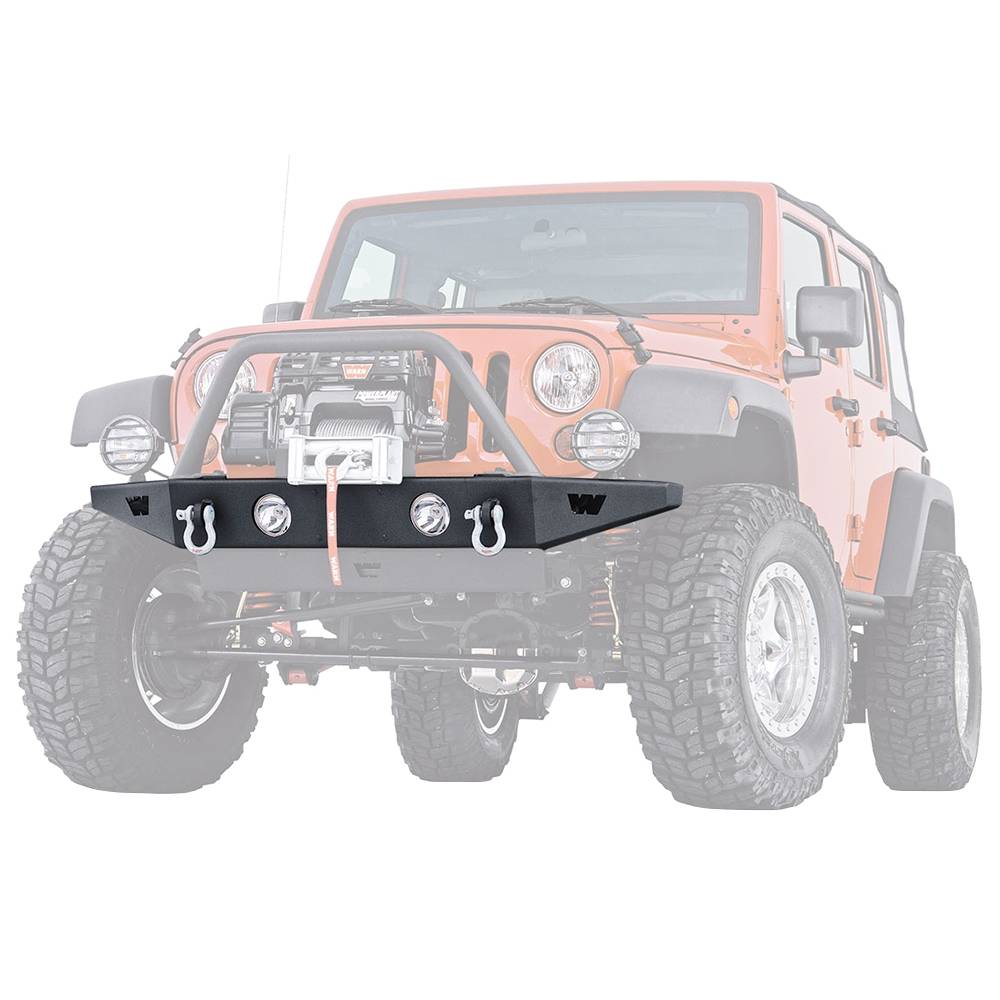The Warn Rock Crawler Bumper is constructed from heavy 3/16 Inch and 1/4 Inch steel, and is CNC formed and robotically welded. The bumper features tapered ends for an increased approach angle; welded eyelets to mount D-shackles, for increased recovery options, and round light ports. For added vehicle protection, there's an optional front Grille Guard Tube. to top it off, a black powder-coated wrinkle finish provides good looks and outstanding durability.