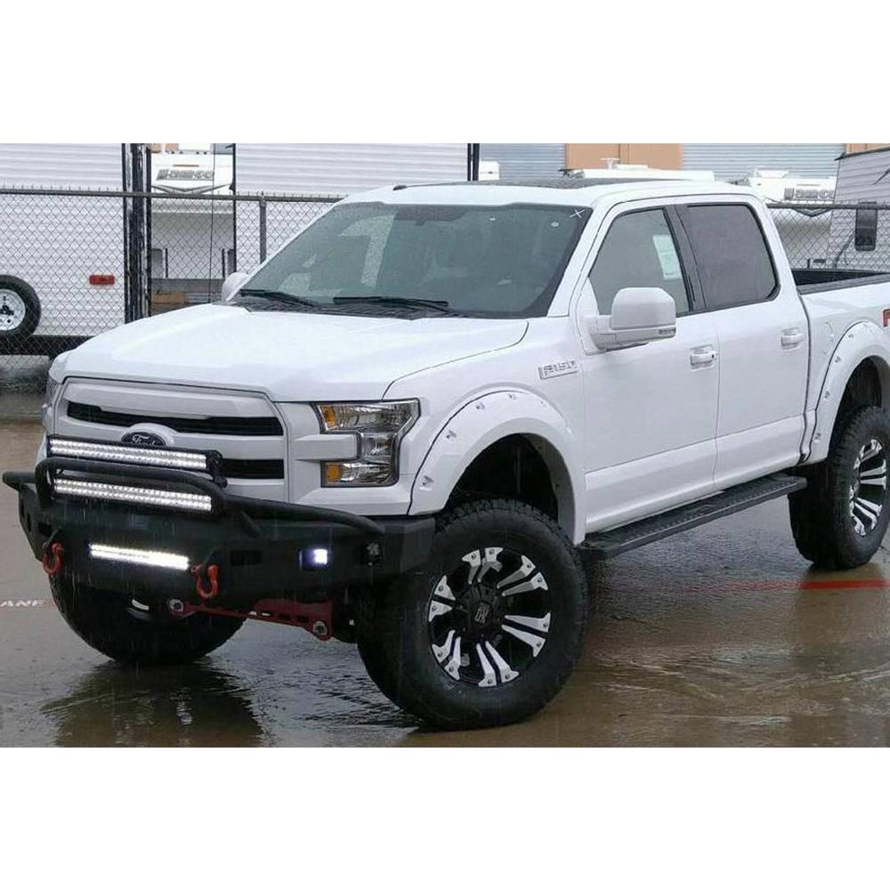 Hammerhead front bumpers are designed to stand up to the punishment of on-road and off-road driving. This front bumpers accommodates up to four 3.25" x 3.25" external dimension cube after-market off-road fog lights, as well as lights on the pre-runner bar and a 20" light bar in the center of the bumper. Reinforced to allow for extra strength while keeping the bumper as light as possible. The 0.750" thick shackle mounts are a part of the mounting surface to the frame, extending through the bumper and are welded on the inside and outside of the bumper. The pre-runner brush guard is made with 1.75" x 0.120" wall tubing. Has air vents to increase the air flow to the radiator and intercooler on EcoBoost models. Currently does not work with adaptive cruise control. This bumper will not accommodate a winch or front receiver hitch.
