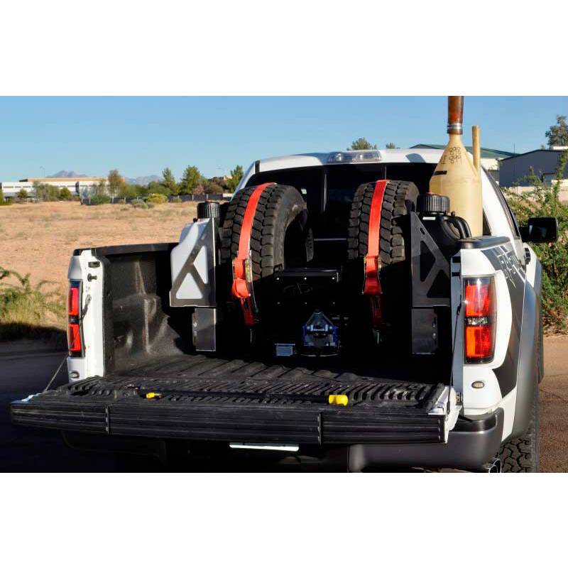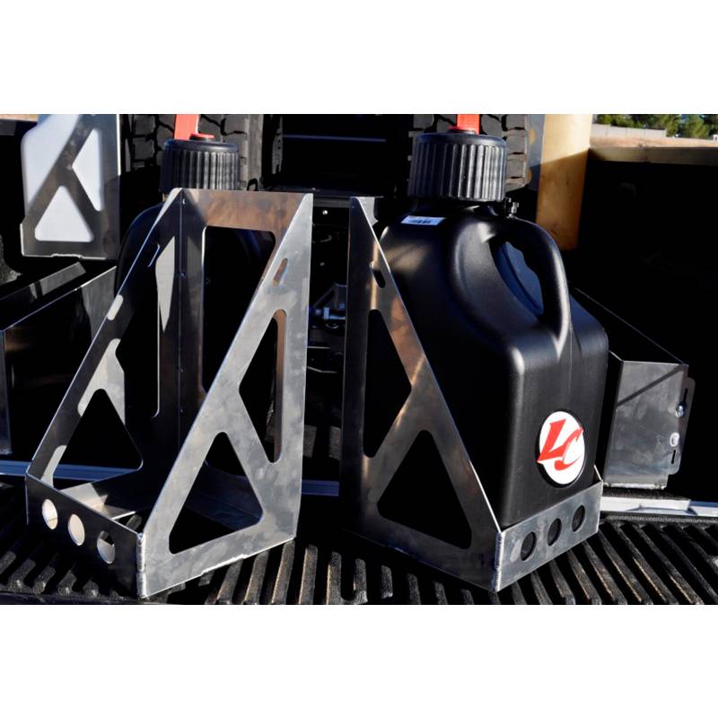 The new bed cage for the F-Series trucks makes getting all of your gear out to the races or weekend on the trail easy, while looking incredible doing it! With multiple mounting options for fuel cans and accessories, these can be tailor made to suit your needs, yet flexible enough to adapt for different adventures. The lockable toolbox allows for safe storage for all of your trail tools and the optional pull out drawers fit quart just perfectly. Accessory mounts for 5 gallon square fuel tanks, round dump cans, powertank 10 lb. CO2 inflator tanks, and race jacks. Mix and match to get all of your required items out with you and safely held down in your bed. There are 6 mounting locations for fuel tanks, dump cans and CO2 bottles. Only 2 dump cans mounts can be used per side due to their larger size, but a CO2 bottle can be fit with 2 dump cans on a side. Accessory mounts are raw aluminum and can be powdercoated hammer black match the bed cage. Optional drawers only available in raw aluminum.