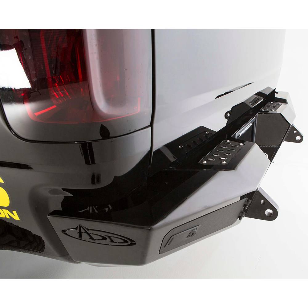 The Chevy Colorado rear honeybadger bumper is just as burly as its front bumper counterpart. The 2015-2020 Colorado rear bumper is available in hammer black powder coat with satin doors on the driver and passenger side locking tool boxes. 100% bolt on.