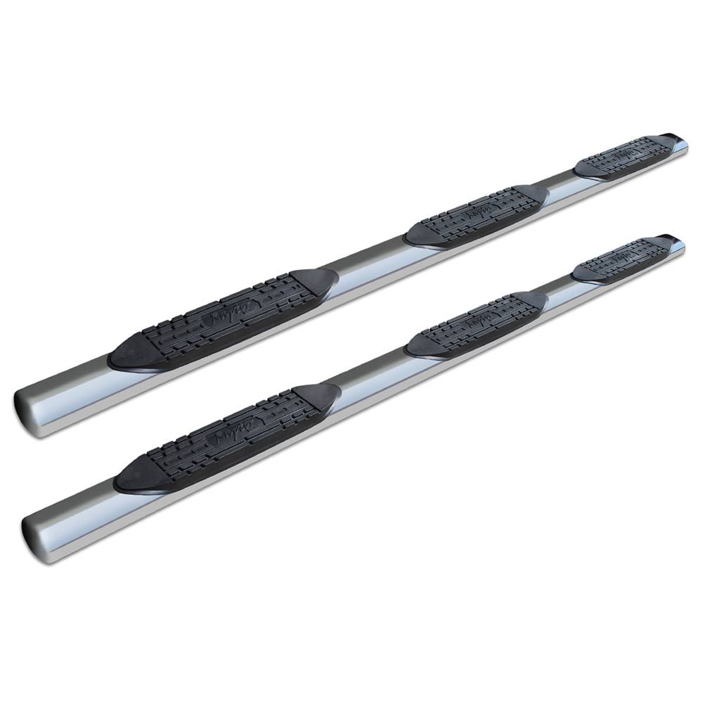 The 5" stainless steel wheel to wheel oval step bars provide a 3rd step for truck bed access without sacrificing that custom look. These bars feature the new wider 5" raised saddle style step pad with the Raptor Series logo in the middle. These tubes come with seamless welded end caps.