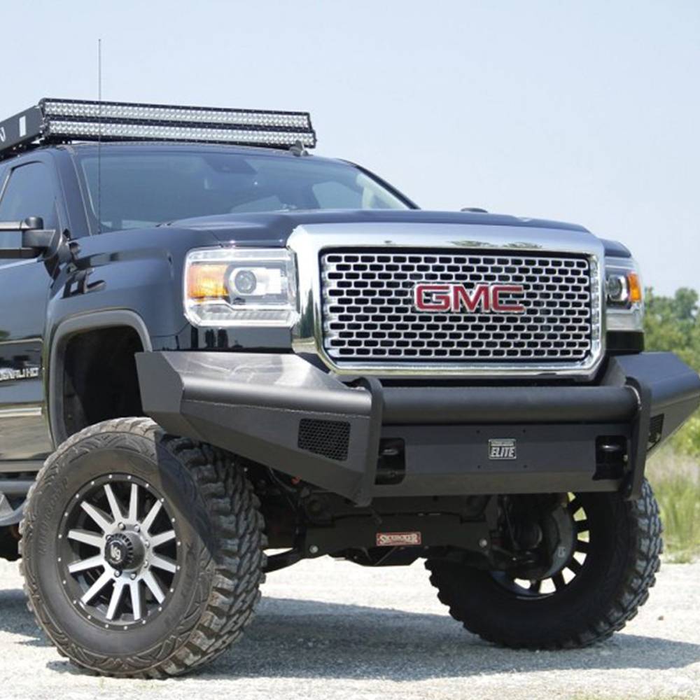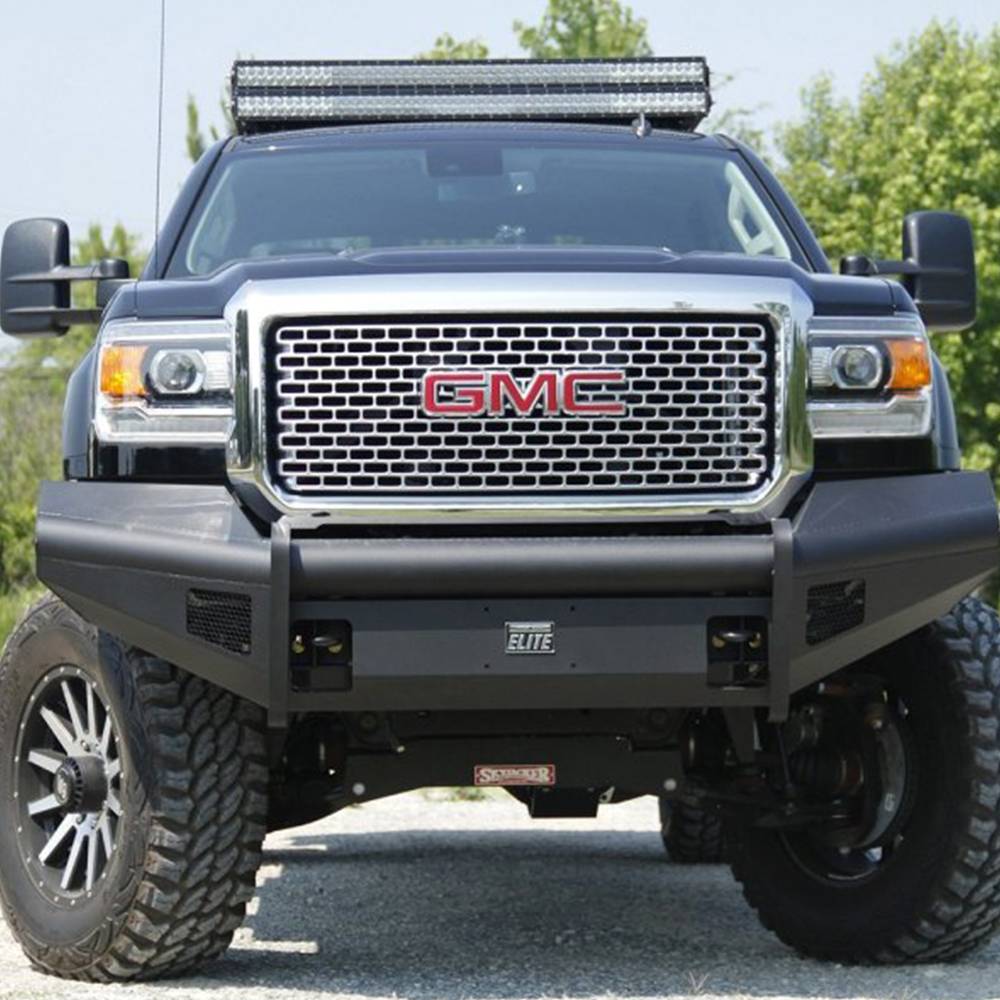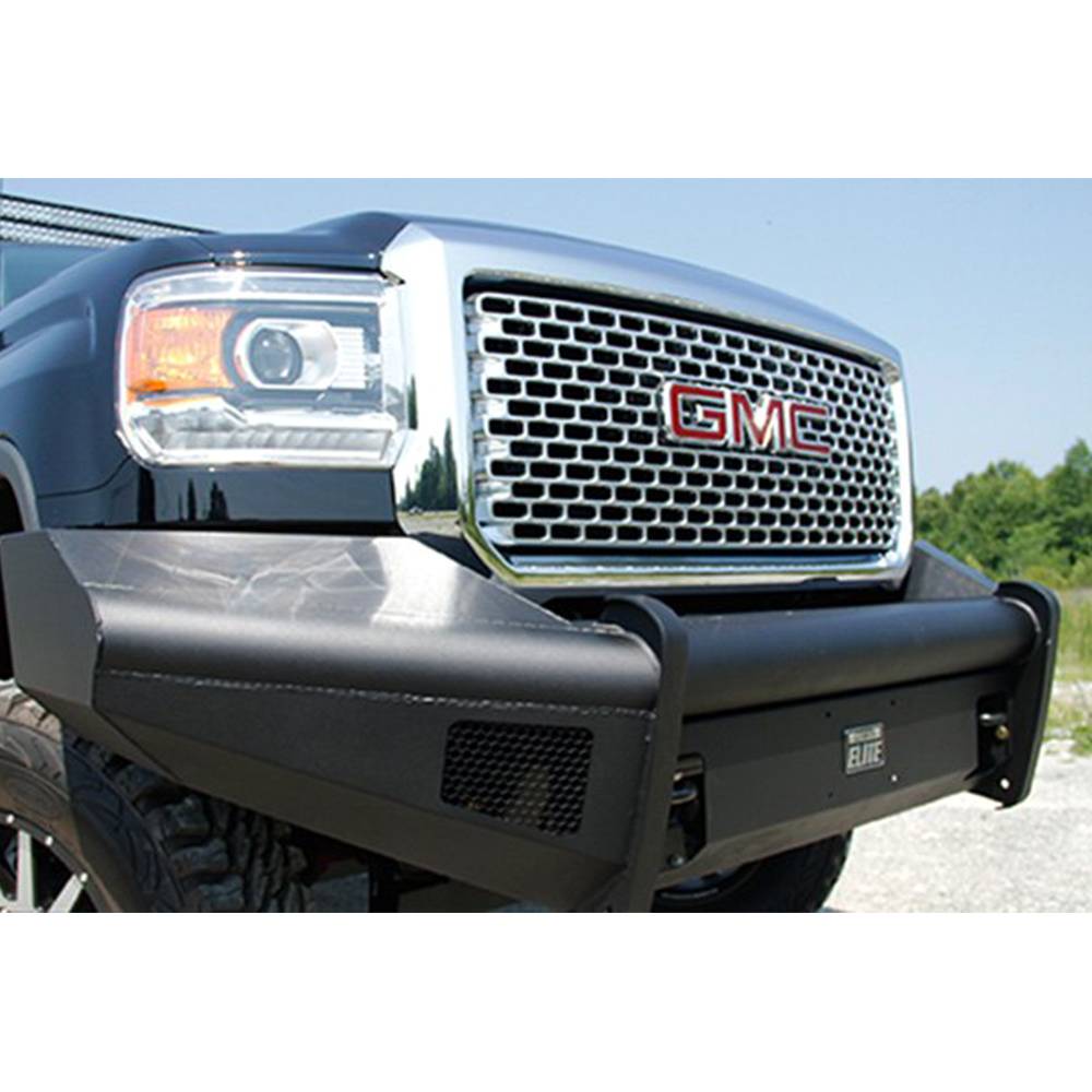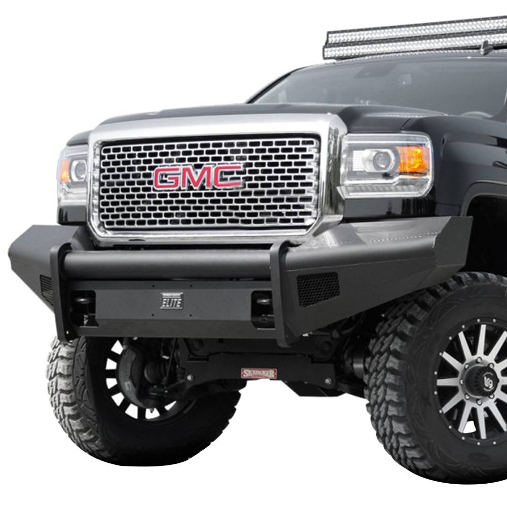 For the GMC HD we took the ranch bumper design and combined it with the smooth plate look from our premium line to create Black Steel Elite. No grill mesh and premium powder coat give the Elite bumpers a unique look.