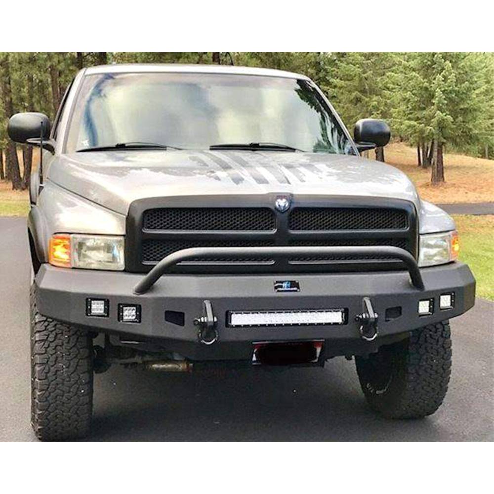Hammerhead front bumpers for the Dodge Ram 1500/2500/3500 are designed for the punishment of on and off road driving. The 1994-2002 model front bumper accommodates up to four 3.25" x 3.25" external dimension cube aftermarket off-road fog lights, as well as lights on the pre-runner bar and a 20" light bar in the center of the bumper. The 0.750" thick shackle mounts are a part of the mounting surface to the frame, extending through the bumper and are welded on the inside and outside of the bumper. The pre-runner brush guard is made with 1.75" x 0.120" wall tubing. This Hammerhead bumper does not accommodate a winch or front receiver hitch.