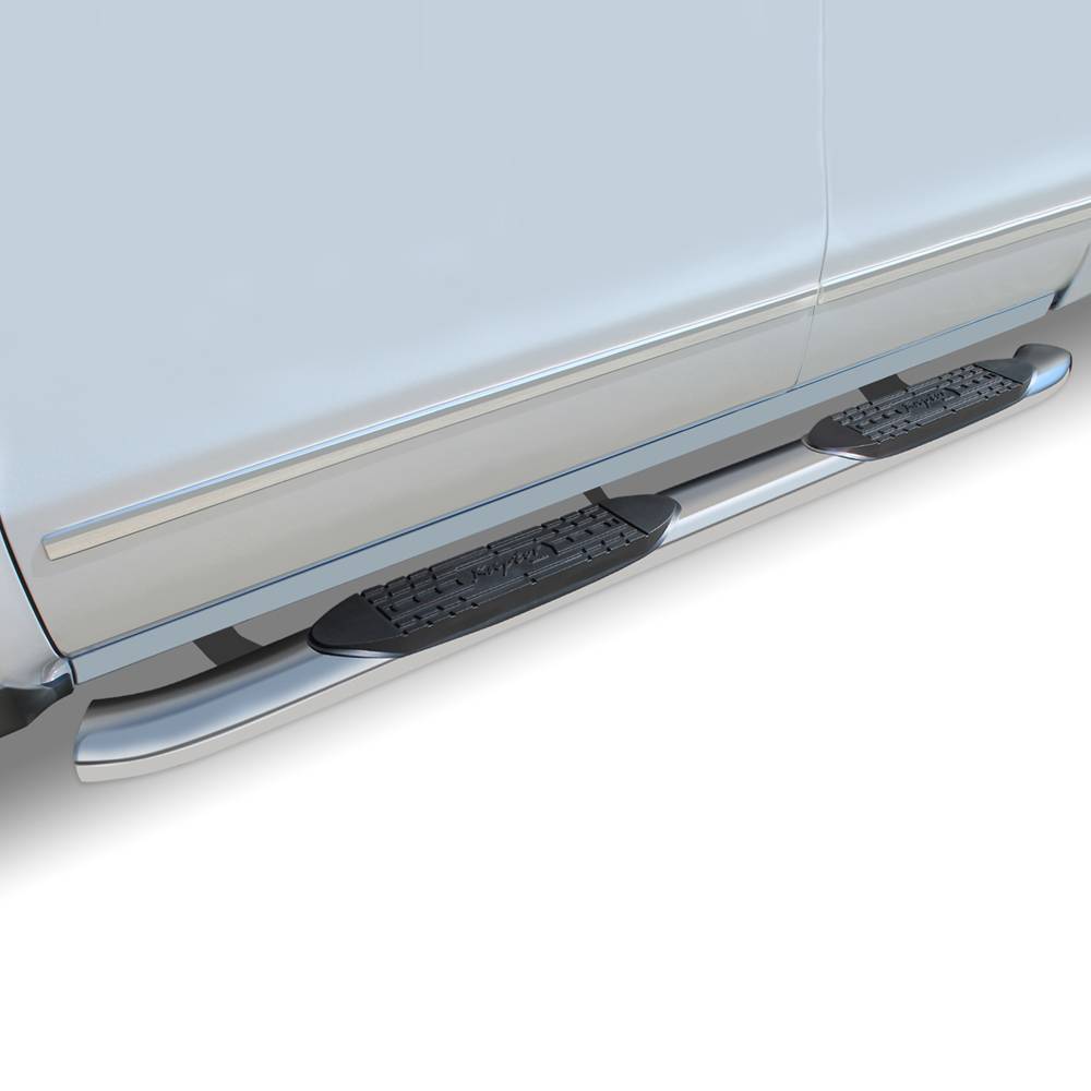 The Raptor Series now offers its new curved 5" OE style stainless steel oval step bars. This new step features seamless welded end caps and 30 degree OE styled bends on each end.