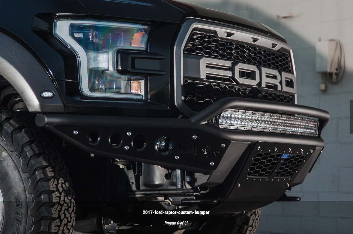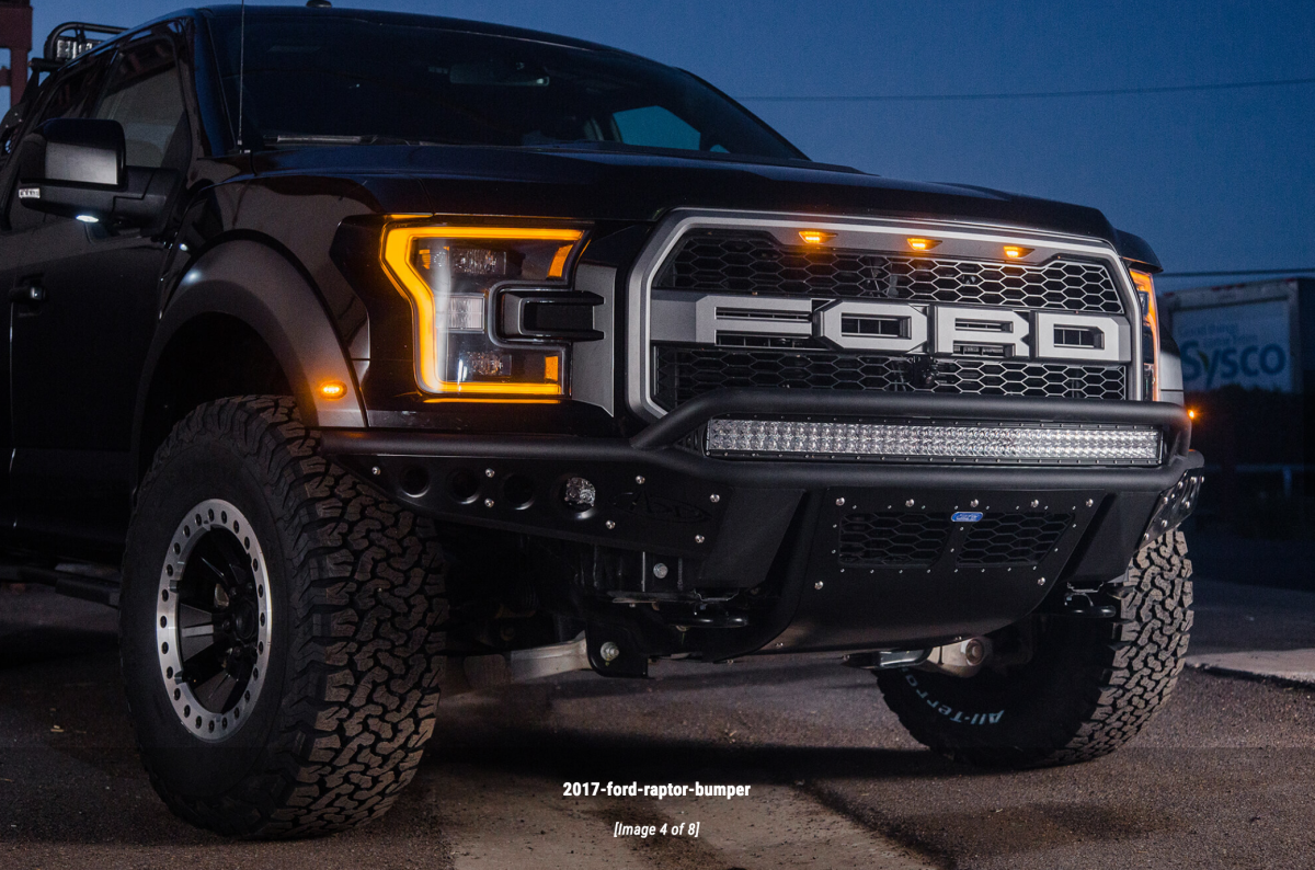 ADD is the leader in the off-road aftermarket parts industry, being the first to market with our hand built custom aftermarket front bumpers for the Ford Raptor. The stealth R front bumper is formed tube made from .120 wall steel, that allows for a tight fitment to the front of your truck. Our universal light mount system on the top of the bumper allows for up to 10 Duallys or a 40" Radius LED bar to be mounted. Mix and match any brand and size lights with the universal light kit to create the perfect lighting combination for your needs. Additional lighting options are available behind the side accent panels accepting a rigid industries dually on each side. A vented skid plate allows the stealth R bumper to maintain airflow to your intercooler. With an integrated scoop behind the skid plate that directs airflow specifically designed for the Ford Raptor. With added ground clearance and a better approach angle the stealth R bumper is one of the most aggressive looking off-road bumpers you can buy for the Ford Raptor.