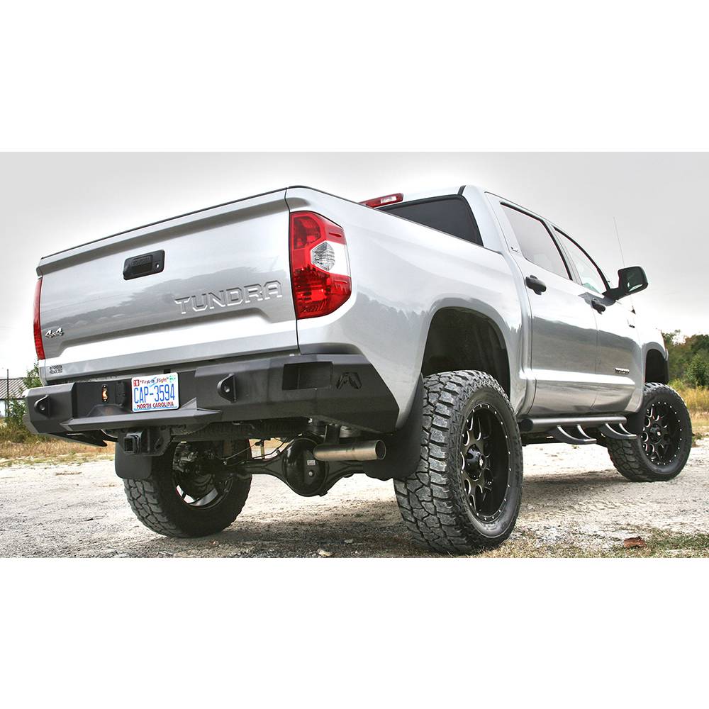 The Fab Fours Toyota Tundra rear replacement bumper integrates the existing receiver hitch. In addition to added style and formed-steel durability, the vehicle gains lower steps and recovery points. Designed to be the ultimate in functionally-stylish rear-end protection.