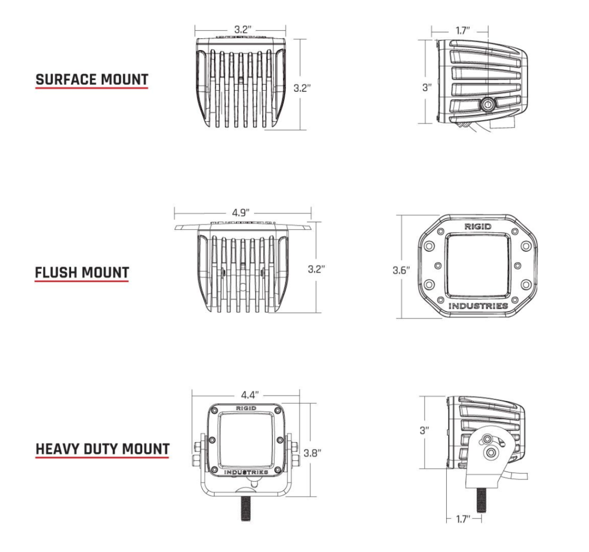 The D-Series has always been the most versatile compact lighting package on the market today. RIGID has just made it professional grade with the D-Series PRO, which offers more light output than ever before thanks to recent advancements in LED technology. Available with a variety of mounting options, including surface, flush, or heavy-duty, the D-Series PRO can be utilized for virtually any lighting application. Measuring just 3” x 3”, the D-Series PRO packs a powerful punch up to 102% more raw lumens depending on the optics chosen. RIGID’s D-Series PRO (Professional Race Output) lights are available with either a black or white finish, and recent updates to the D-Series PRO include new branding and blacked-out circuit boards for a more refined look. They feature the same superior build quality as the rest of RIGID’s lighting products, providing reliable and efficient lighting on demand.