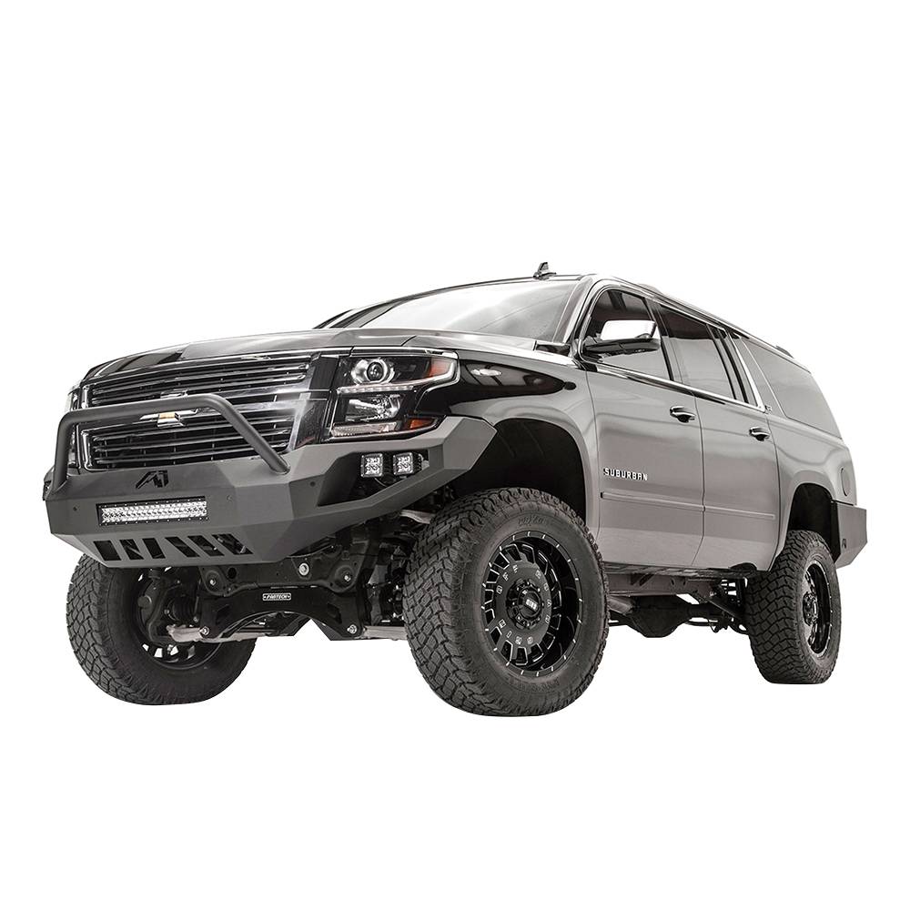 The Chevy Suburban new line of Fab Fours lightweight bumpers: Vengeance Series. These front bumpers offer premium steel sensors and are designed to be lightweight and give your vehicle a sleek finish for the rear and front of your Chevy Suburban. Integrated 20 inch light bar housing in the middle and has options for mounting on each side for (2) 3x3 LEDs to give you the highest amount of LED light coverage. The fit of this front bumper has a high and tight fit. The lower cutouts on this bumper provide increased airflow while offering your Chevy Suburban an aggressive when you're on or off the road.