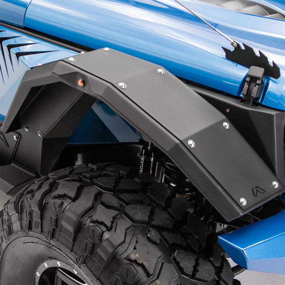 The Fab Fours Front Fender Replacement System focuses on aggressive styling, ease of installation, and modularity. A complete bolt on system with optional parts that adds greater tire clearance and allows you to run a larger tire. All parts are 100% US steel.