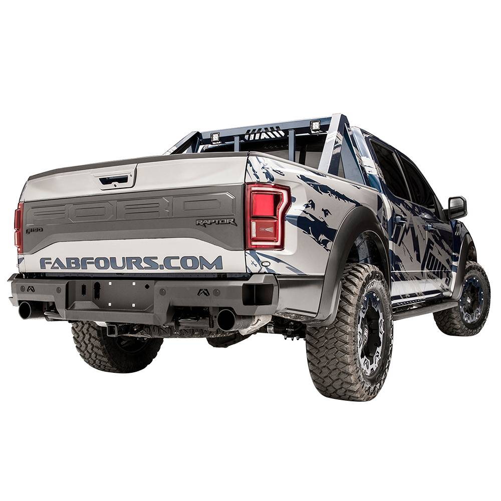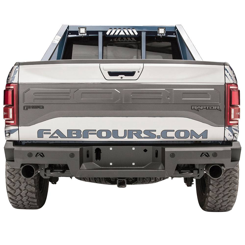 The Fab Fours Ford Raptor rear replacement bumper integrates the existing receiver hitch. In addition to added style and formed-steel durability, the vehicle gains lower steps and recovery points. Designed to be the ultimate in functionally-stylish rear-end protection.