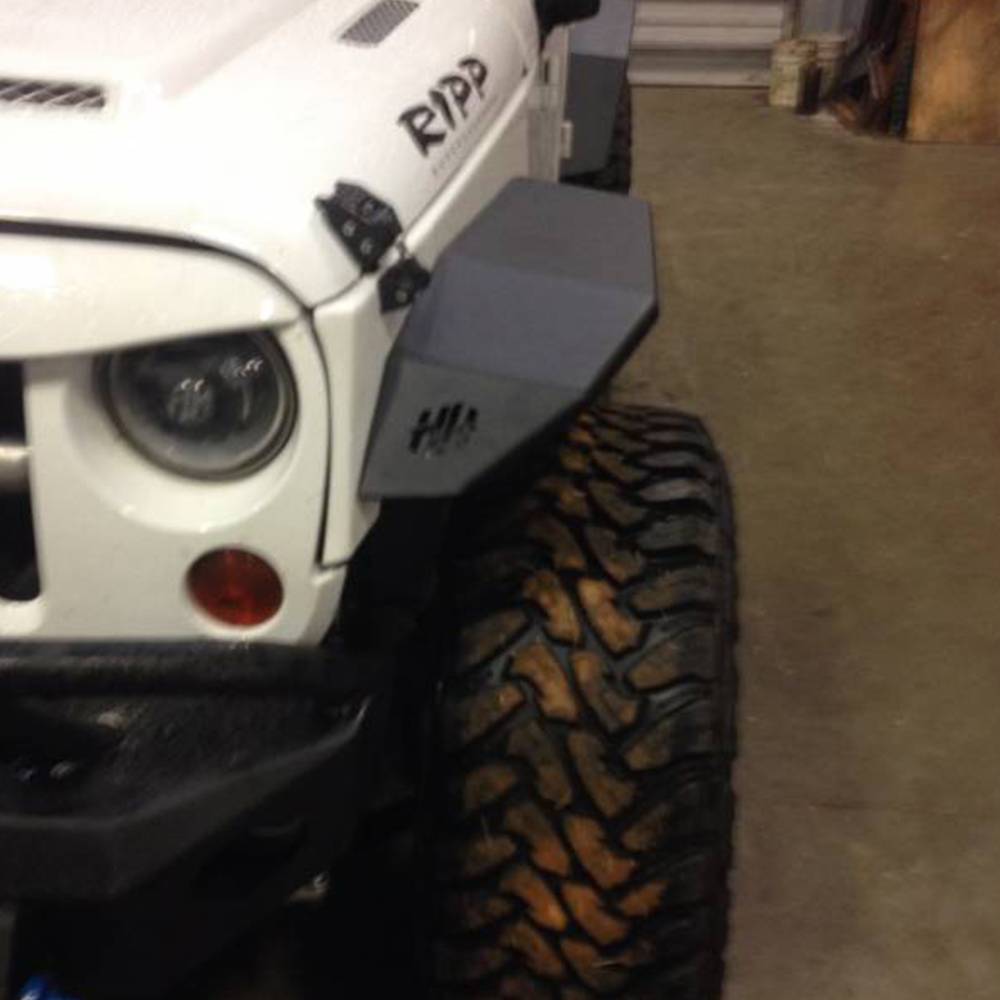 Designed to bolt directly to your Jeeps body in the OEM locations without drilling or modifying the body of the vehicle. Provide superior protection to your Jeep when hitting the trail while also giving the ability to run larger tires with less lift for a lower center of gravity. Ability to run 35" tires on a stock height Jeep. The body of your Jeep will be protected while not losing the clean body lines of the OEM fenders. These flares will work with both 2-door and 4-door models. Will Only work with the Hammerhead Armor Fenders. Will Not work with the OEM fenders.