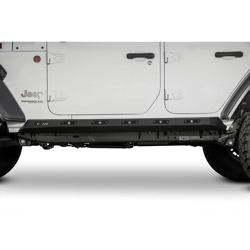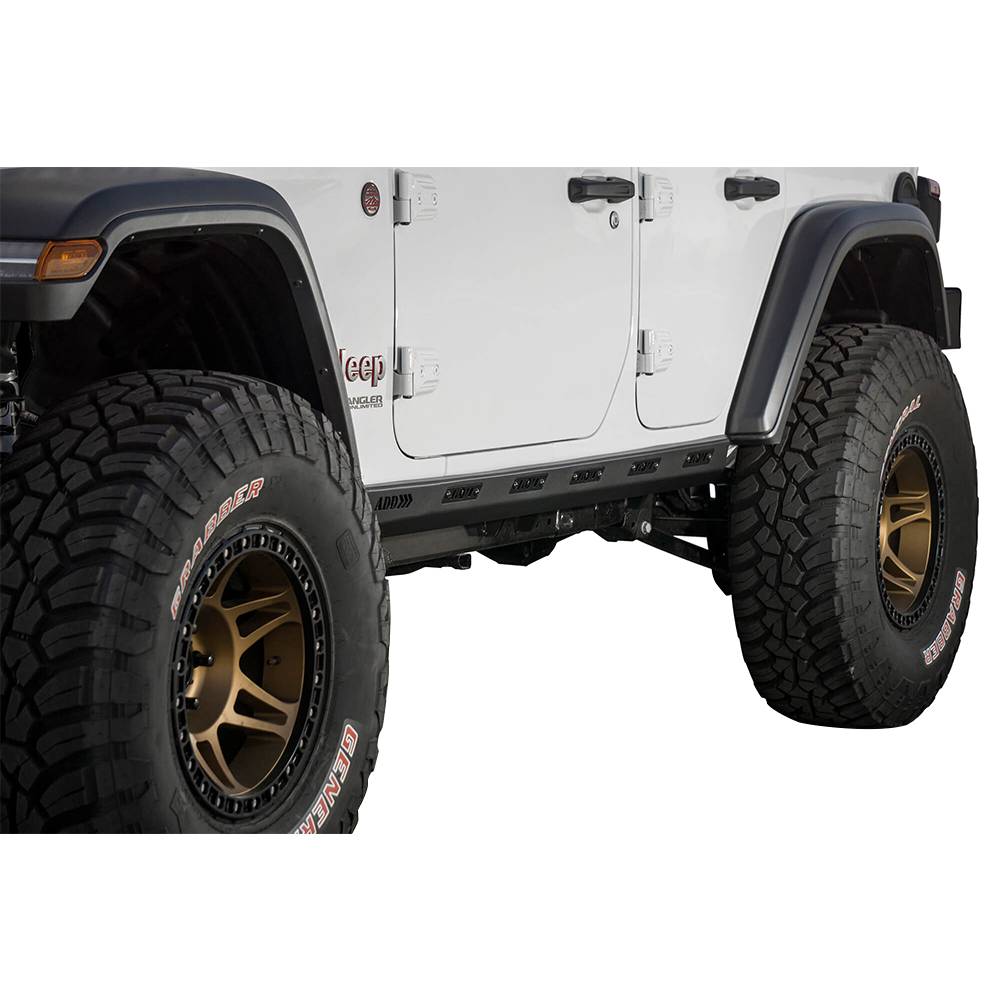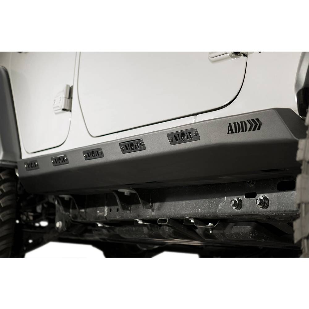 ADD jeep wrangler JL rock slider side steps are built with function in mind. The bottom of the step is a smooth plate of 3/16" steel providing your jeep wrangler with protection in the most extreme conditions. Bolting directly to the vehicle's body mounts give the jeep JL rock sliders extra strength over the OEM steps while also allowing rocker guards to cover more of your underbody. Each rock slider includes accommodations for additional lighting for your wrangler. Five provided rock light mounts per step are universal and can mount any brand of rock light. Lights are aimed to allow the driver to brighten important parts of the trail that are otherwise hard to see. As always, these jeep wrangler rock sliders are fully bolt-on and made in America.
