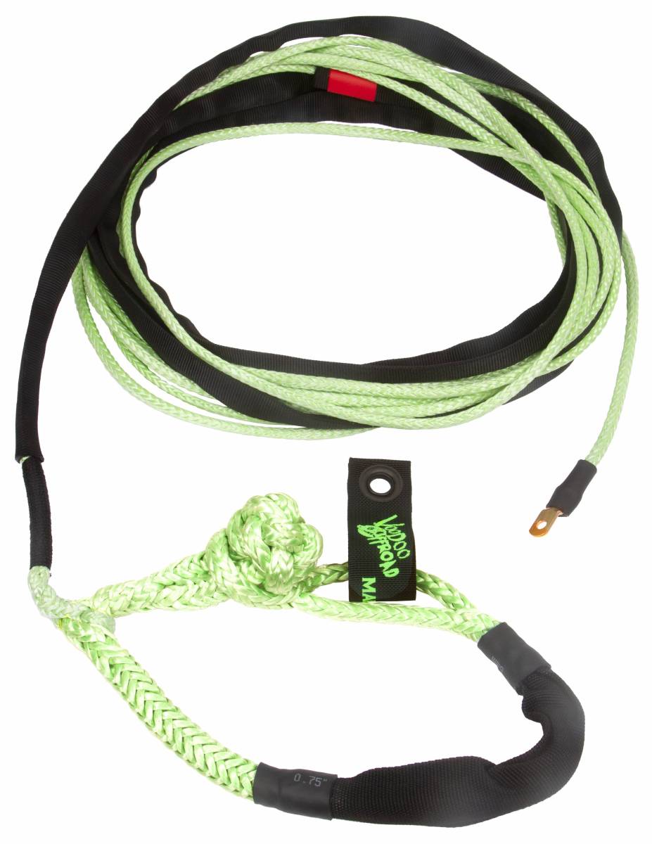Want to get the most performance and best recovery experience out of your winch? Want a soft shackle attachment for quick and easy hook ups to any closed-loop attachment point? Voodoo Offroad Plasma winch lines are the answer! Voodoo Offroad Plasma synthetic fiber winch lines are specially formulated and altered at a molecular level for optimum strength. Since Voodoo Offroad Plasma synthetic winch lines are 86% lighter than steel cable they are easier to handle, quicker to rig and safer to use than any steel cable. They will not rust, corrode or develop skin-tearing "fish hook" burrs as wire rope can. Since Voodoo Offroad Plasma synthetic winch lines develop no kinks and have no memory like steel cable they will spool more evenly and pull off the drum easier than steel making them stronger, safer, and more reliable than any steel cable on the market. Voodoo Offroad Plasma winch lines donÕt store energy so you will get no whiplash or recoil eliminating any opportunity for the rope snapping back. Made in the USA, Voodoo Offroad Plasma synthetic winch lines are ready for the toughest jobs both on- and off-road getting you out of the places you DonÕt Dare to Go!