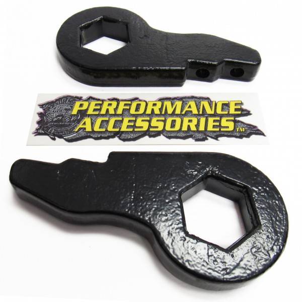 Performance Accessories 1.5-2 inch leveling kit for the Chevy Silverado and GMC Sierra 1500 / 2500 pickups and Avalanche/Tahoe/Yukon/Suburban/Escalade 1500 pickups that maintains the vehicles factory ride. Performance Accessories Forged Leveling Kits Keys are designed to level out the front-to-rear stance of the vehicle. This allows the use of up to 32-inch tires for a more aggressive stance improving ride quality on and off-road while still maintaining proper suspension geometry. Easily installs with in less than 2 hours.