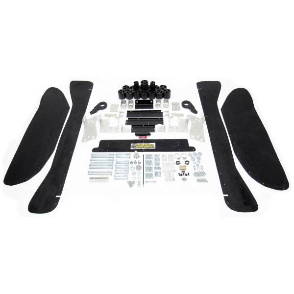 Performance Accessories PAPLS 107 Premium Lift System raises the vehicle 5-inches, by combining the company's high-quality body-lift and leveling kit, allowing the vehicle to run up to a 33-inch diameter tire. The kit includes forged torsion bar keys, high pressure fiberglass reinforced nylon lift blocks, 3/16 inch thick laser cut and powder coated bumper relocation brackets, a CNC machined and zinc plated steering extension, high strength hardware, extension brackets, and urethane wheel-well extensions (Gap Guards) that conceal any gaps between the body and frame. This system can be installed in 9 hours and comes complete with everything necessary for installation.