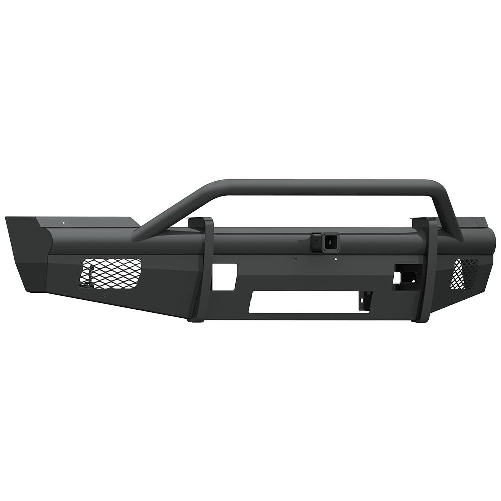 Vaquero is a no frills cattle pushin front end replacement bumper by Road Armor. This modular front bumper accommodate the factory fog lights when equipped and also accommodates the OEM tow hooks. We build this rugged beast using 11 Gauge smooth steel for the outer shell, 1/4" gusseting and bracketry and the classic beefy schedule 40 pipe.