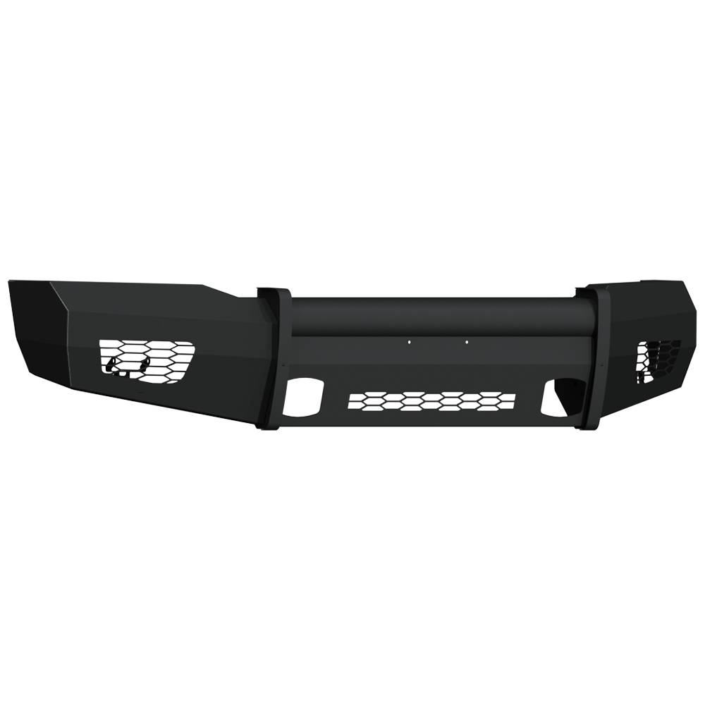 Vaquero is a no frills cattle pushin front end replacement bumper by Road Armor. This modular front bumper accommodate the factory fog lights when equipped and also accommodates the OEM tow hooks. We build this rugged beast using 11 Gauge smooth steel for the outer shell, 1/4" gusseting and bracketry and the classic beefy schedule 40 pipe.