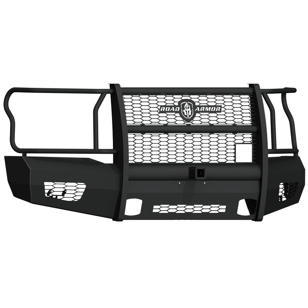 Vaquero is a no frills cattle pushin front end replacement bumper by Road Armor. This modular front bumper accommodate the factory fog lights when equipped and also accommodates the OEM tow hooks. We build this rugged beast using 11 Gauge smooth steel for the outer shell, 1/4" gusseting and bracketry and the classic beefy schedule 40 pipe.
